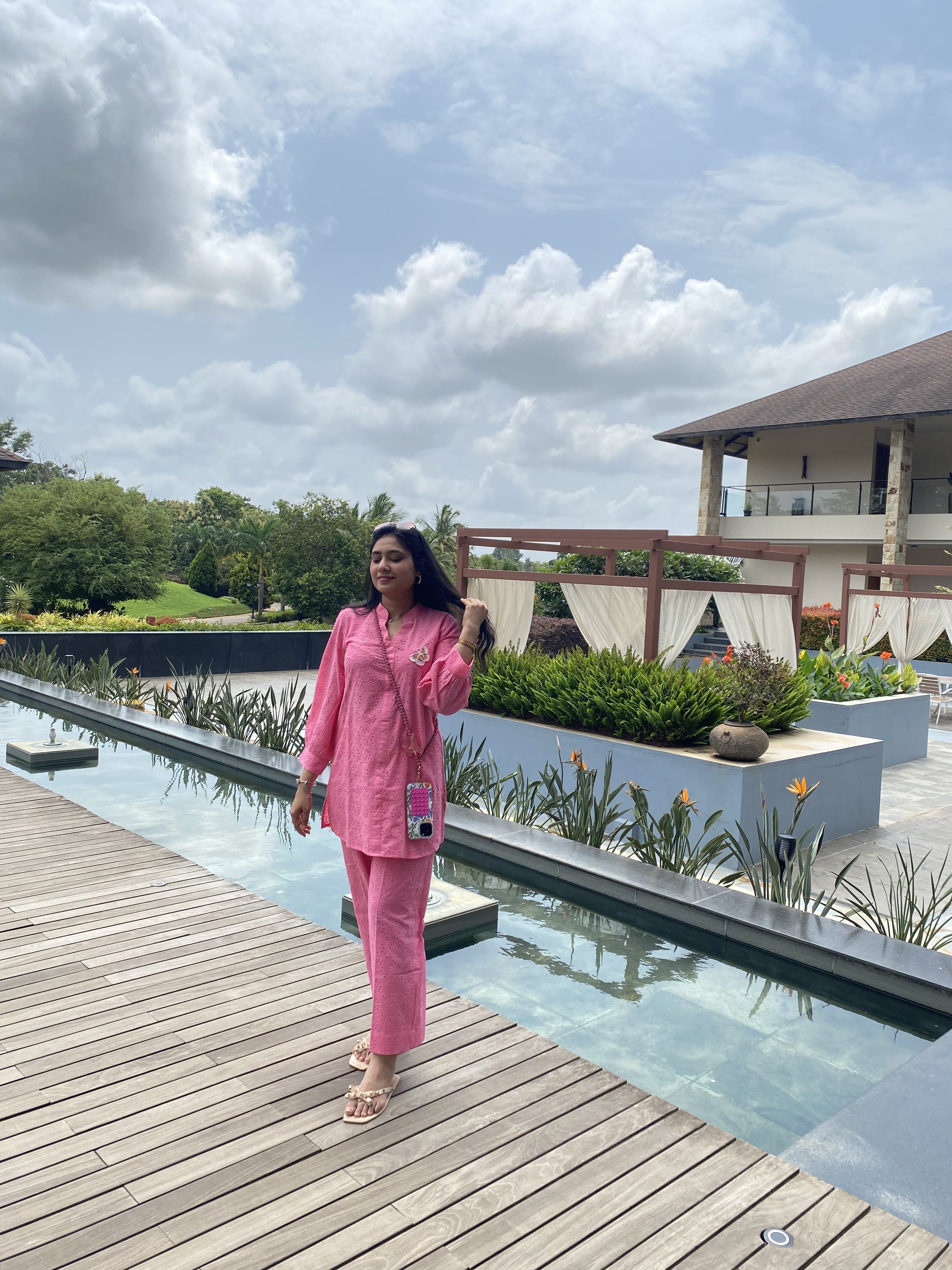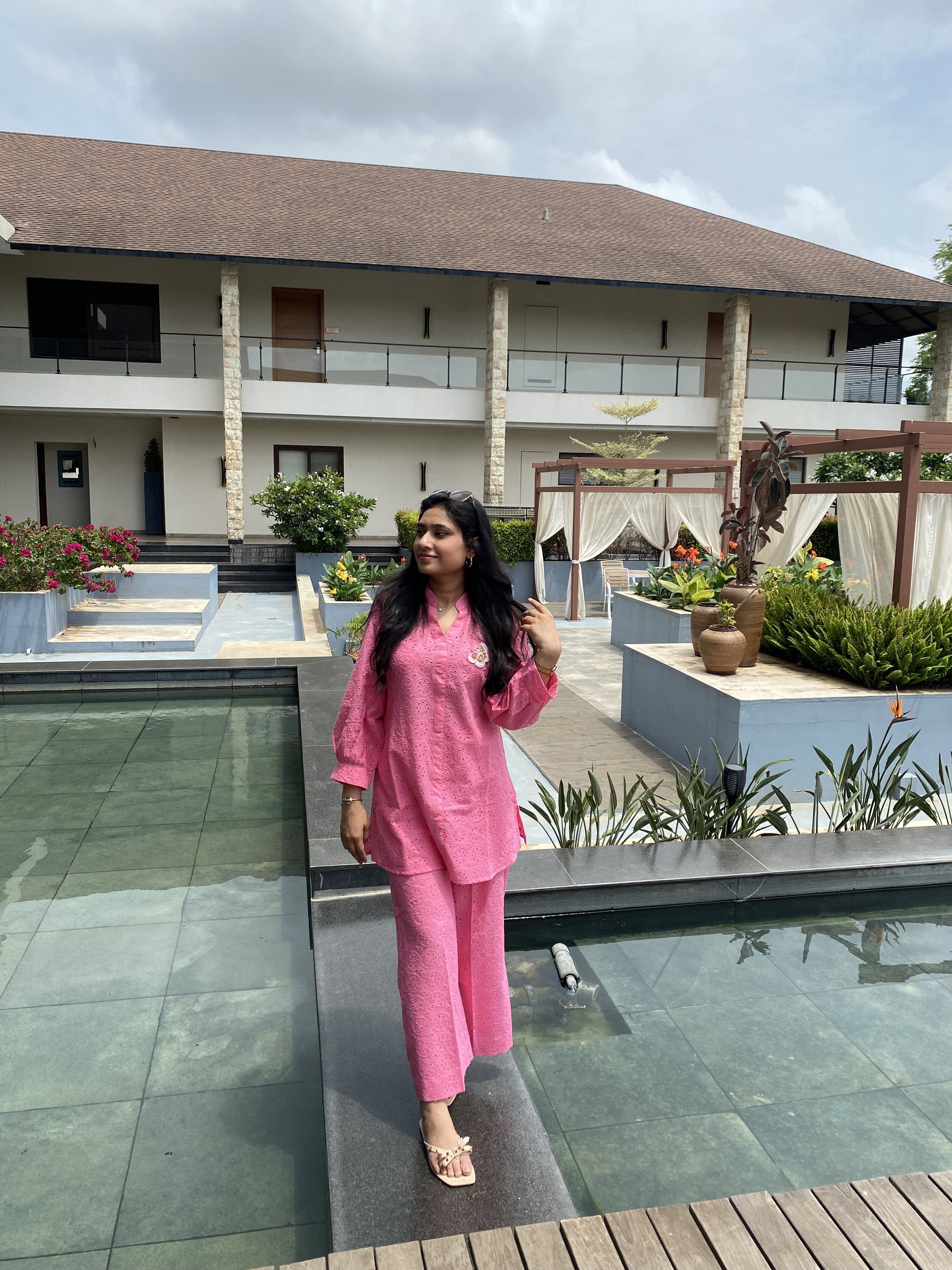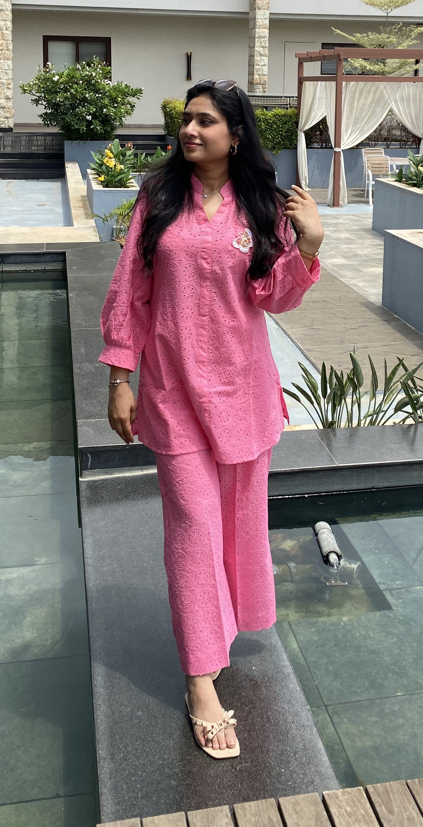 Playful And Pretty, This Bubblegum Pink Coord Set In Breathable Cotton Chicken Fabric Showcases Delicate Embroidery And A Flattering, Easygoing Fit—Ideal For Sunny Days And Casual Outings.