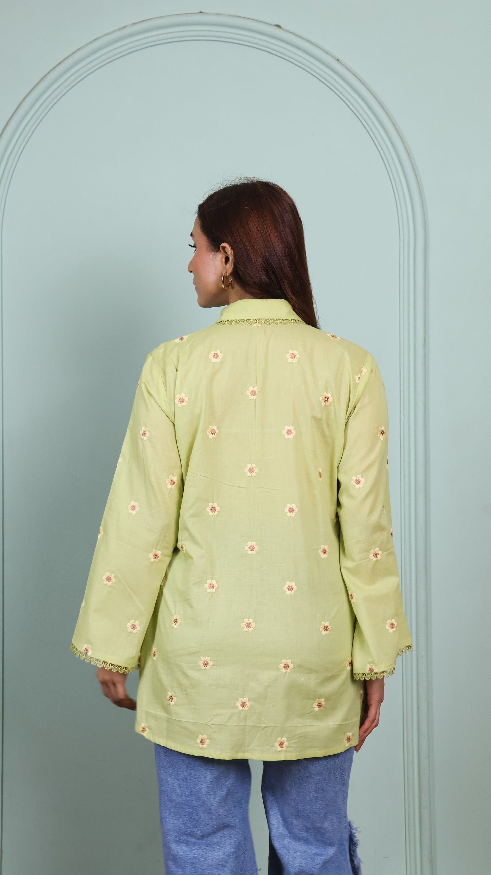 Elegant And Fresh, This Green Lace Shirt Features Delicate Embroidered Flowers—Adding A Touch Of Romance To Your Everyday Style.