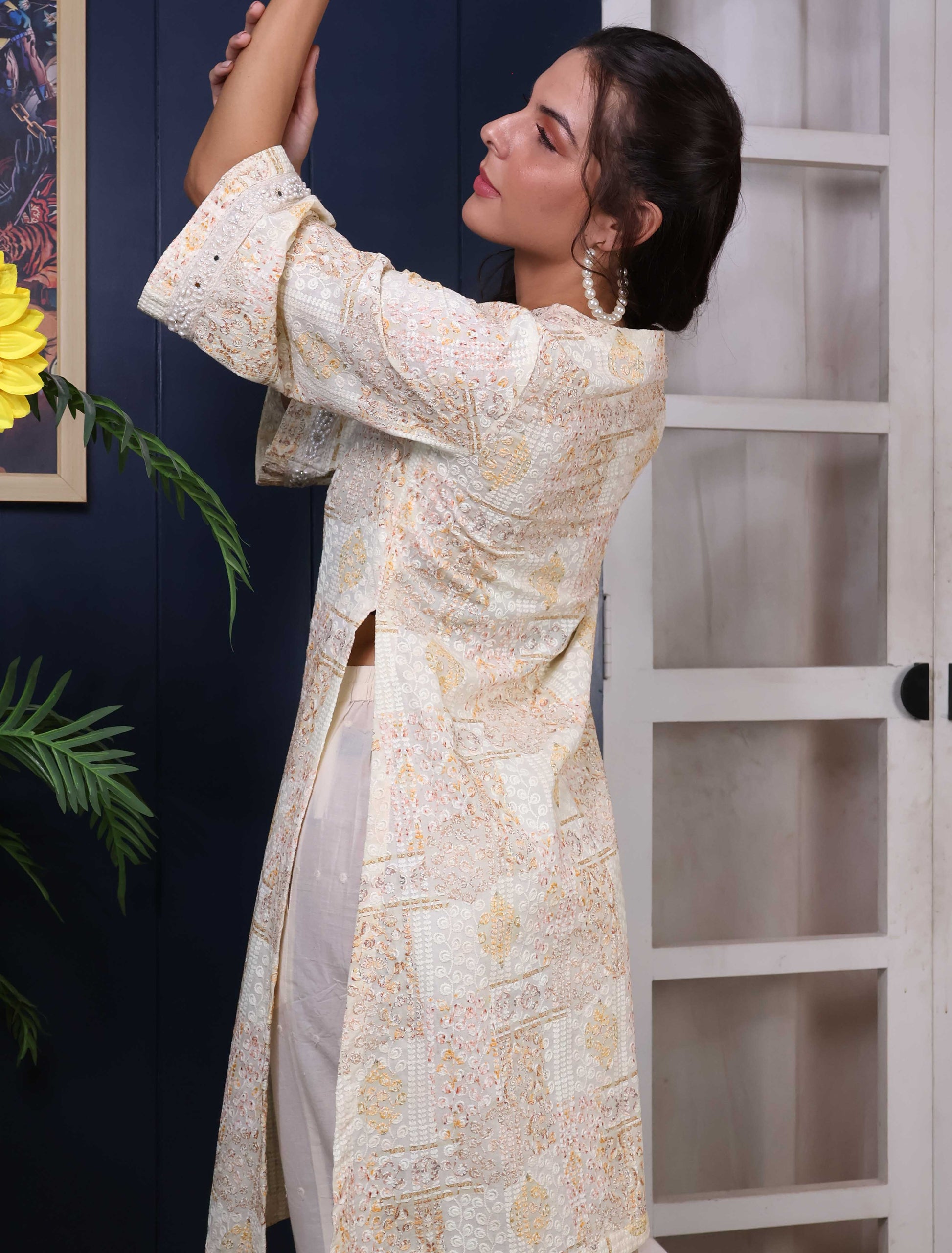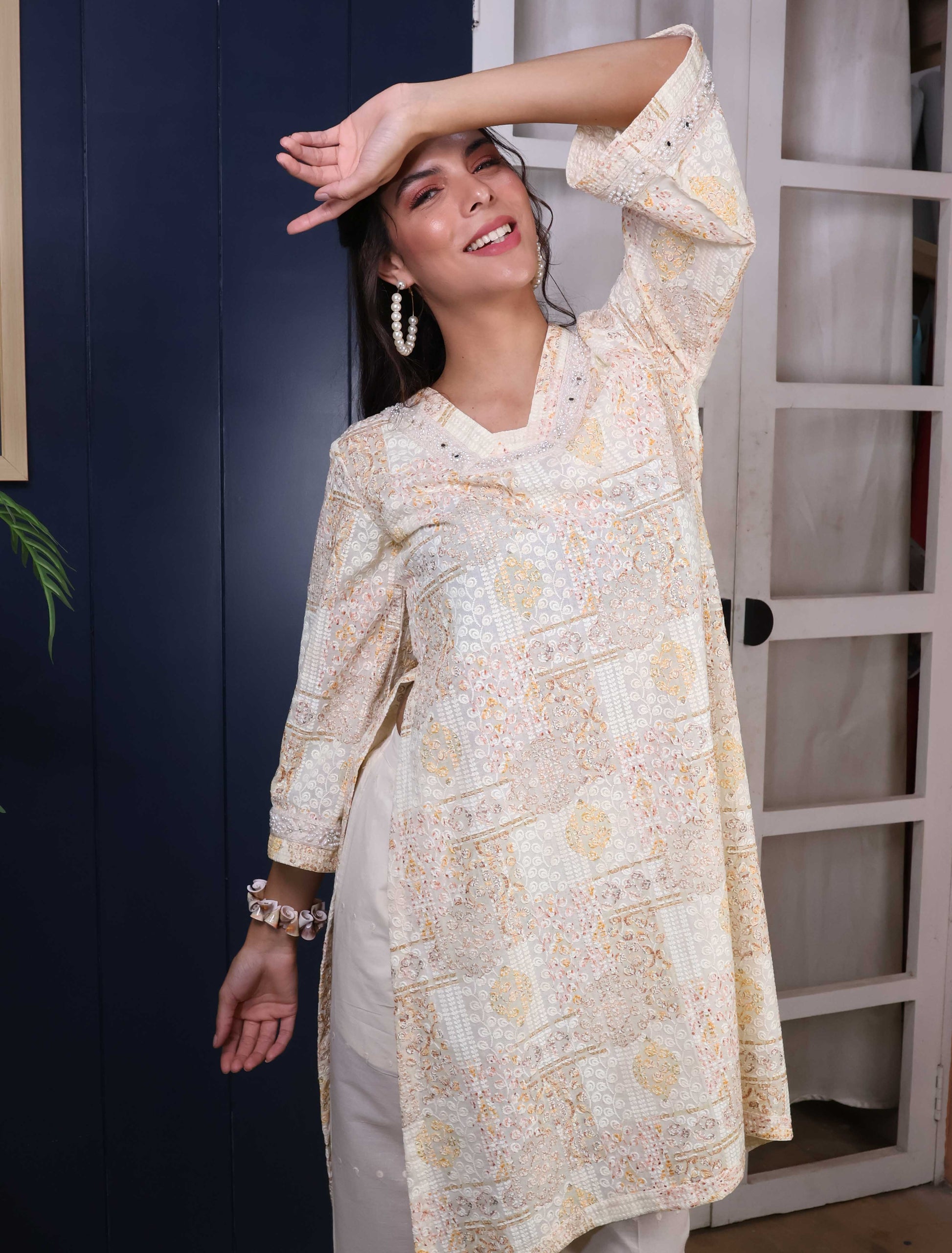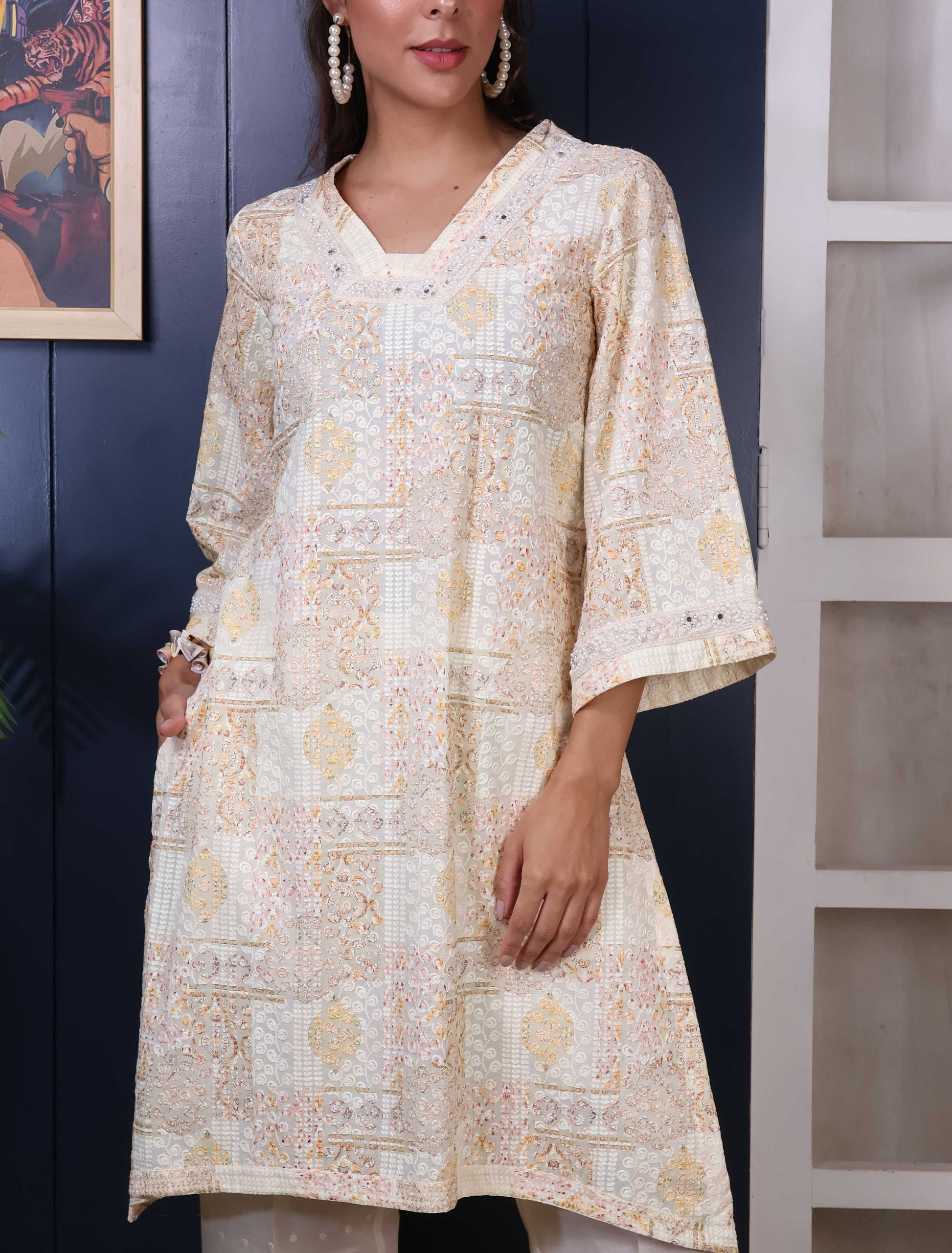 A chicken embroidery kurta and pant set in off-white is a classic and elegant choice, perfect for a variety of occasions. The kurta is typically made from fabrics like cotton, which are ideal for showcasing intricate embroidery while ensuring comfort and breathability. Off-white is a soft, neutral shade that provides a subtle elegance and versatility, allowing the embroidery to stand out beautifully. Chicken embroidery, also known as "chikan," is a traditional form of hand-embroidery from Lucknow, India. It features delicate, intricate patterns often including motifs like flowers, vines, and paisleys. The embroidery are done in matching or contrasting threads, like white-on-white for a subtle effect or pastel hues for a soft pop of color. The kurta have a classic straight cut, an A-line shape, and slightly flared. It features details like a round or V-neckline, side slits for ease of movement, and possibly some decorative borders or panels. Cotton or a cotton blend, chosen for its comfort and breathability. It complements the kurta and balances the intricacy of the embroidery. The pants are usually tailored for a relaxed yet streamlined look. They could be straight-legged, slightly tapered, or even with a soft, flowing cut.