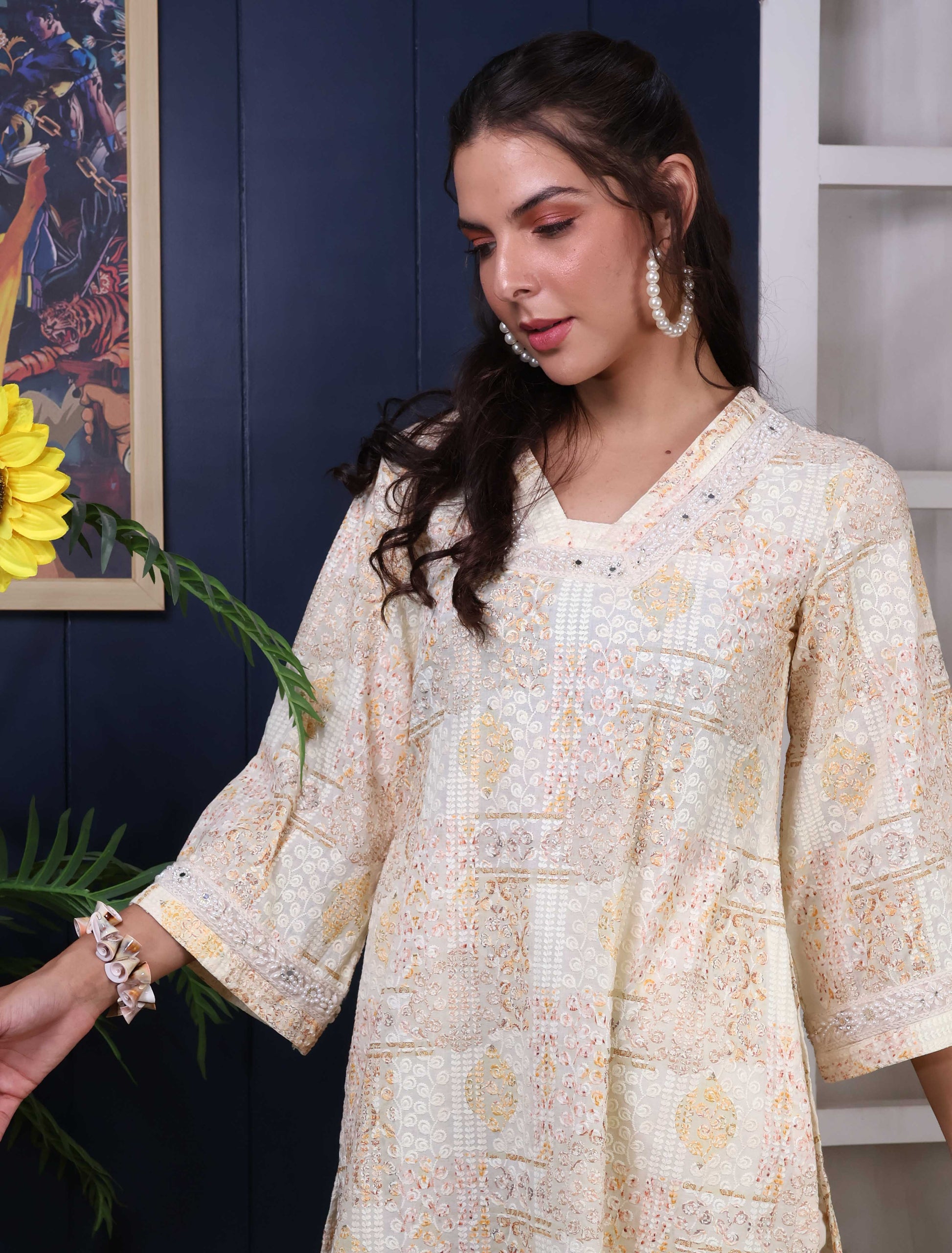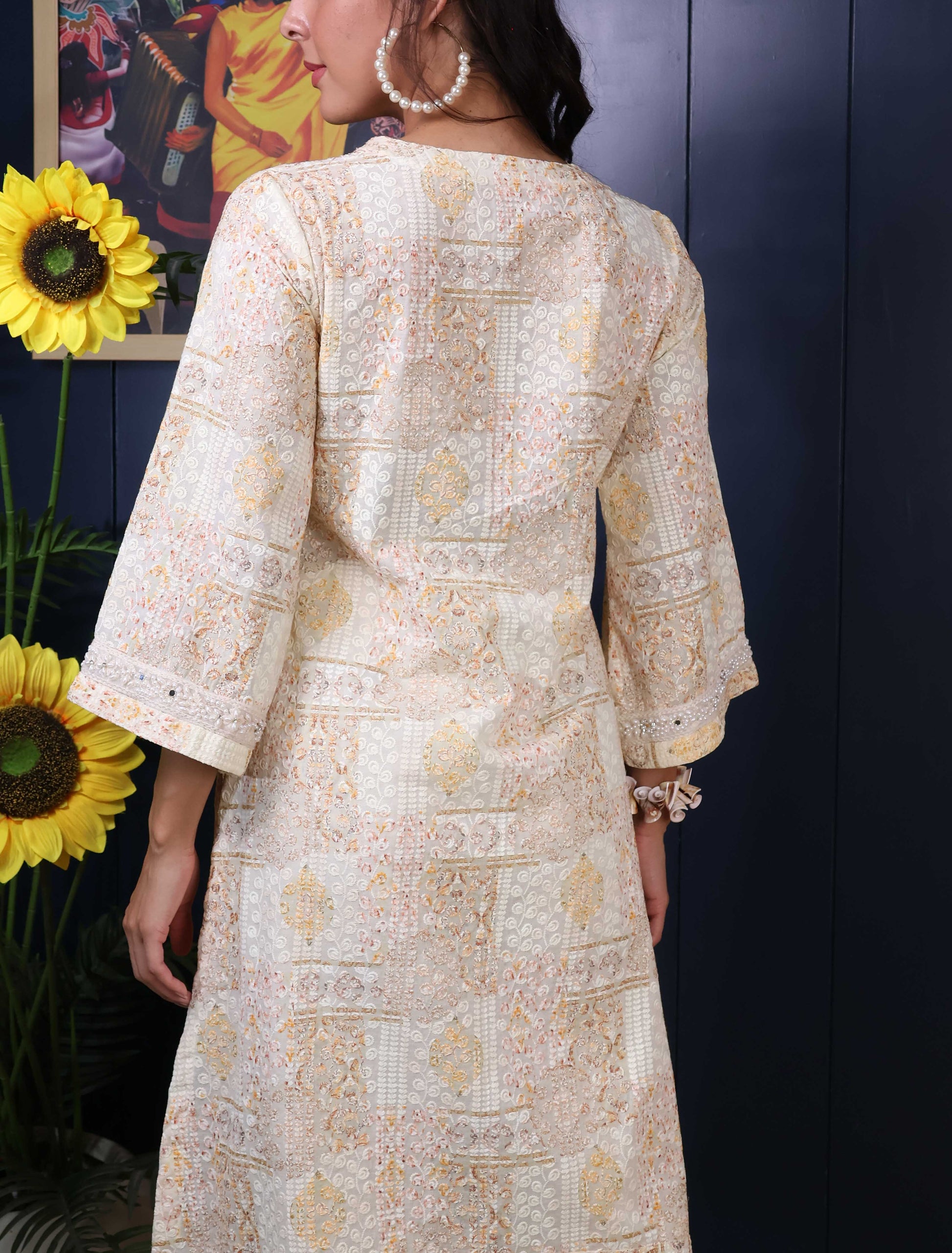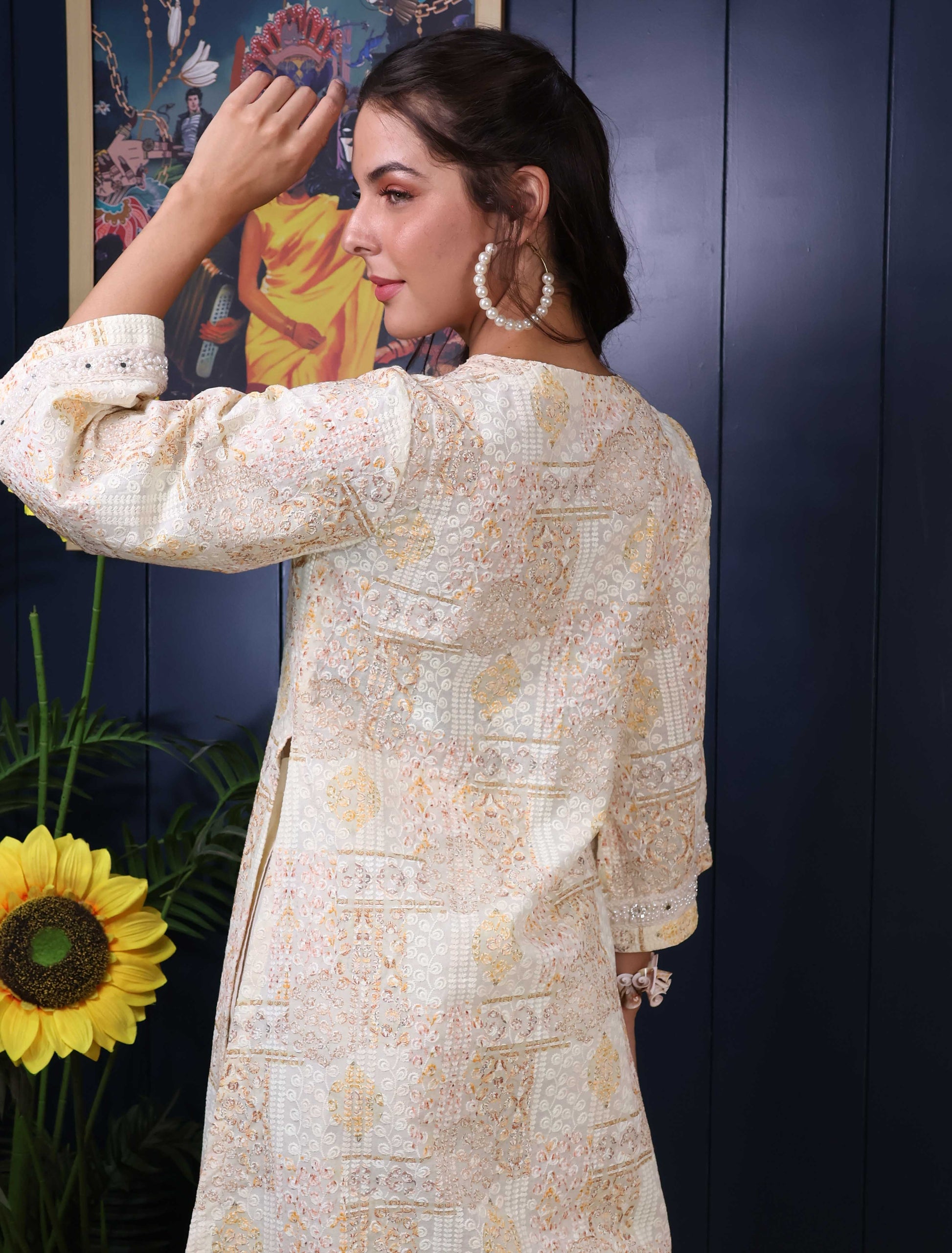 A chicken embroidery kurta and pant set in off-white is a classic and elegant choice, perfect for a variety of occasions. The kurta is typically made from fabrics like cotton, which are ideal for showcasing intricate embroidery while ensuring comfort and breathability. Off-white is a soft, neutral shade that provides a subtle elegance and versatility, allowing the embroidery to stand out beautifully. Chicken embroidery, also known as "chikan," is a traditional form of hand-embroidery from Lucknow, India. It features delicate, intricate patterns often including motifs like flowers, vines, and paisleys. The embroidery are done in matching or contrasting threads, like white-on-white for a subtle effect or pastel hues for a soft pop of color. The kurta have a classic straight cut, an A-line shape, and slightly flared. It features details like a round or V-neckline, side slits for ease of movement, and possibly some decorative borders or panels. Cotton or a cotton blend, chosen for its comfort and breathability. It complements the kurta and balances the intricacy of the embroidery. The pants are usually tailored for a relaxed yet streamlined look. They could be straight-legged, slightly tapered, or even with a soft, flowing cut.