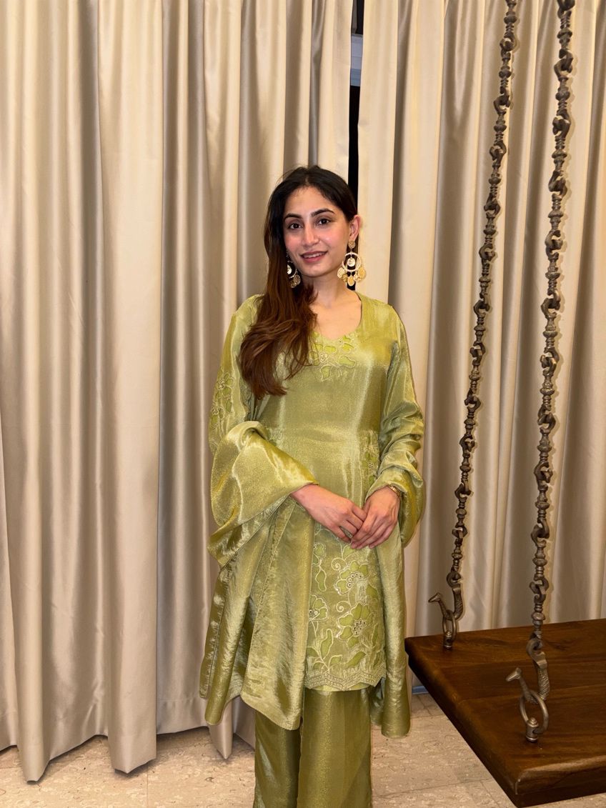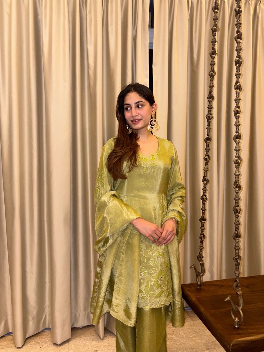 Elegant Green Tissue Suit Set crafted in a luxurious tissue fabric that gives a subtle sheen and regal appeal. Paired with plain matching pants and a lightweight plain tissue dupatta, this ensemble blends minimalism with sophistication β perfect for festive gatherings, evening soirees, or celebratory occasions