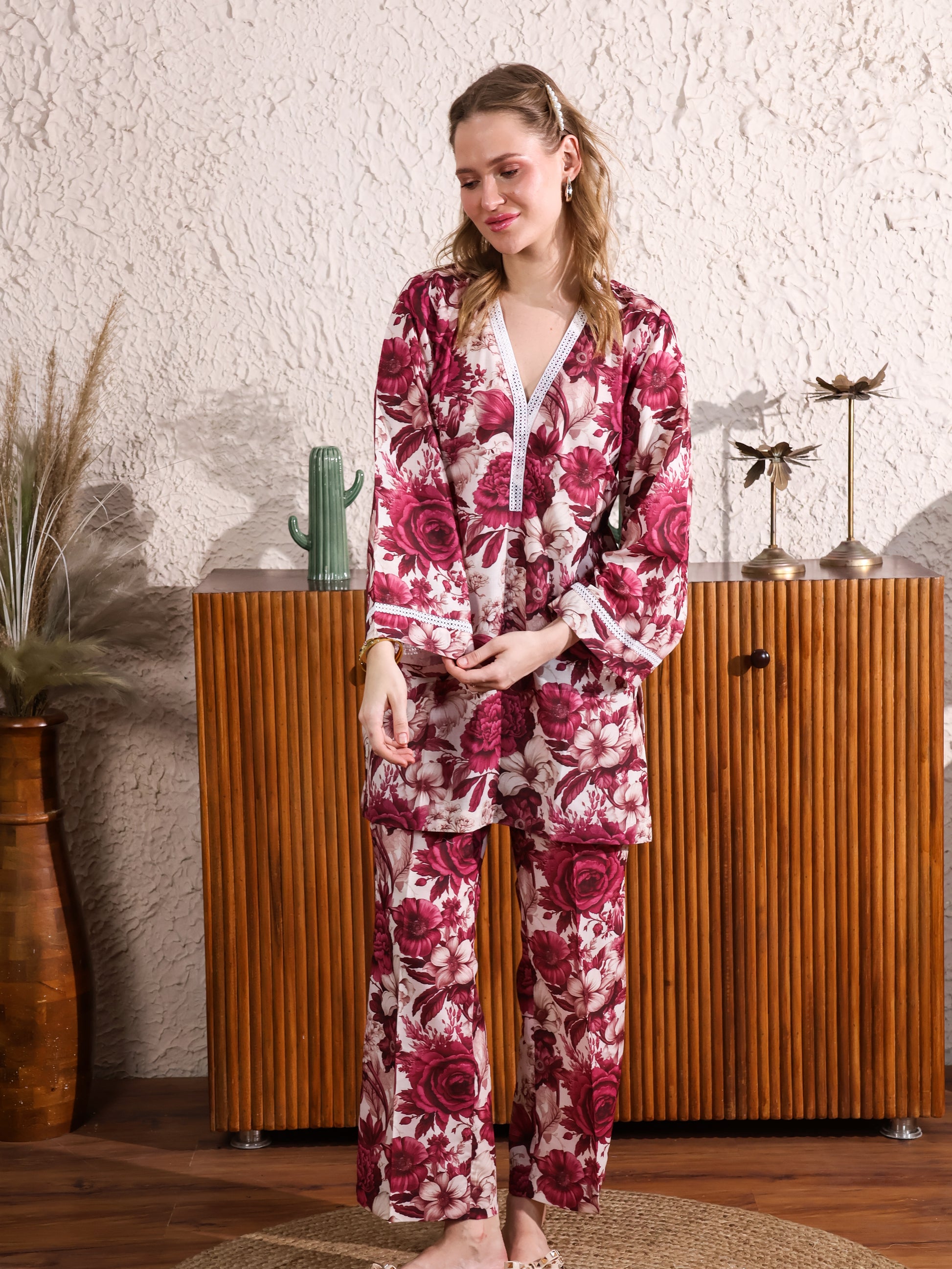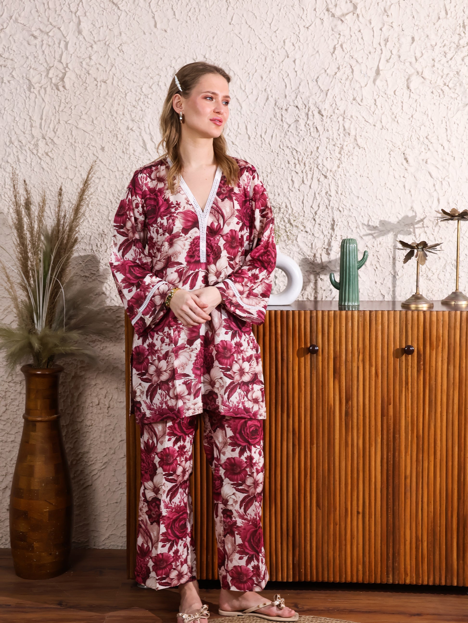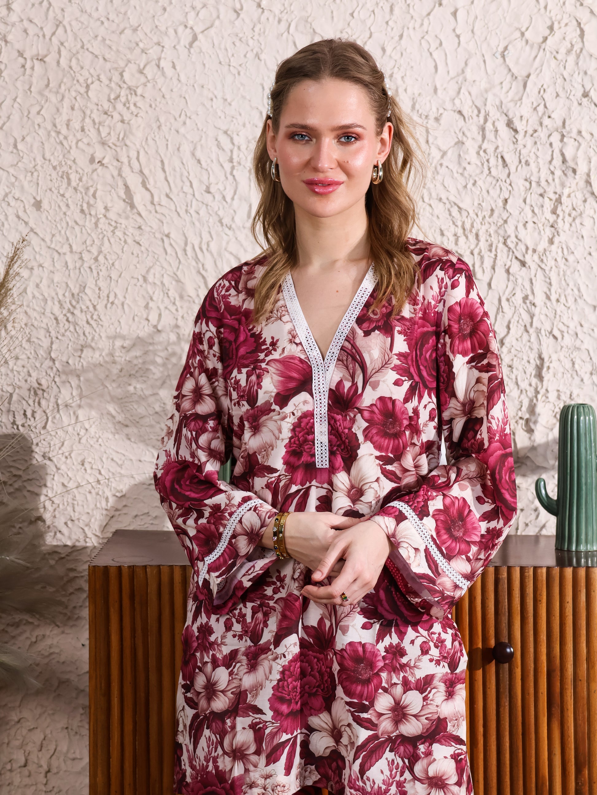 This Japanese Cotton Floral Printed Coordset features a charming floral print, paired with lace detailing on the neckline and sleeves for a delicate, feminine touch. The soft cotton fabric ensures comfort, while the lace accents elevate the design for a sophisticated look. Perfect for casual outings or special occasions with a blend of elegance and ease.