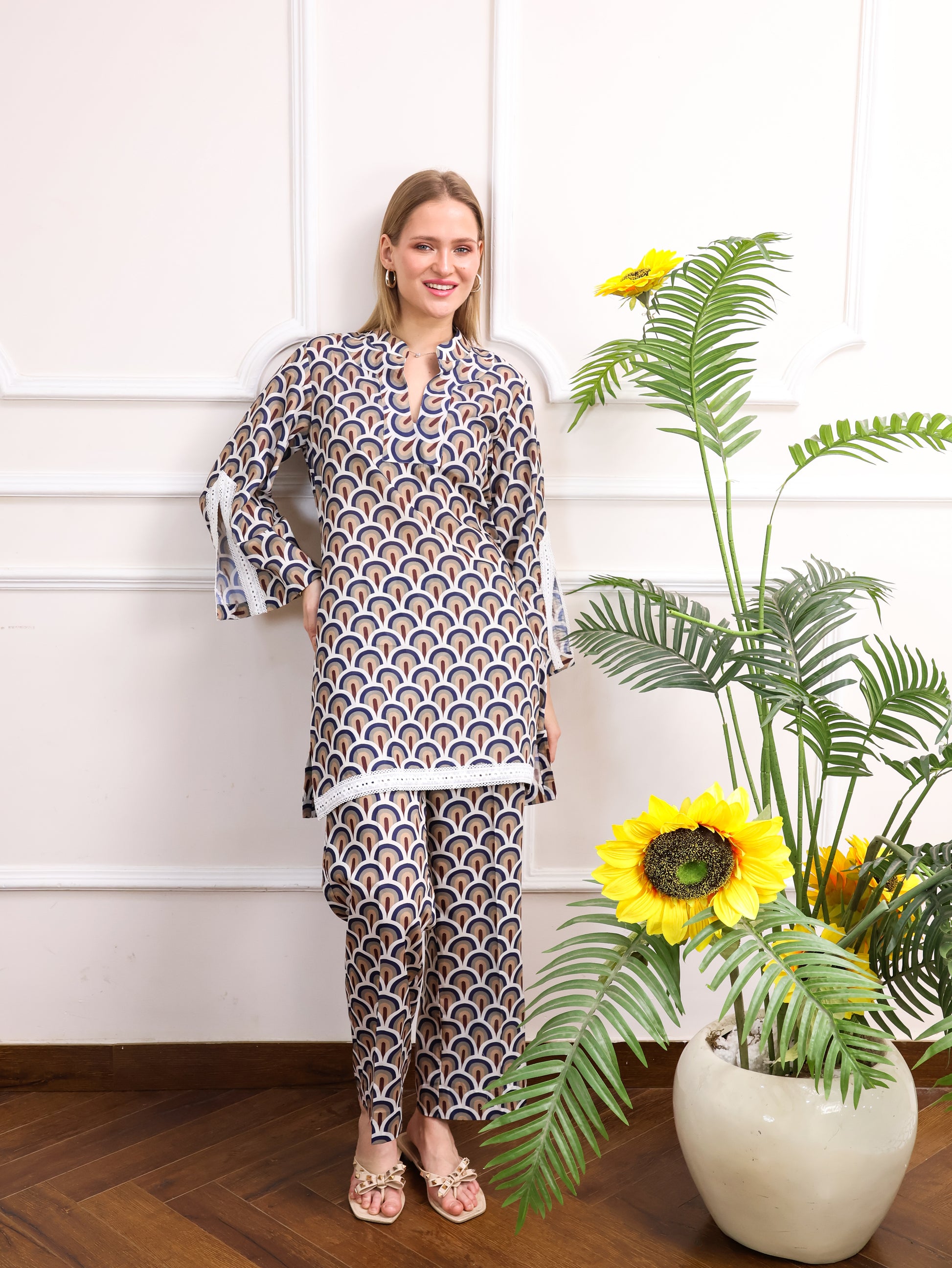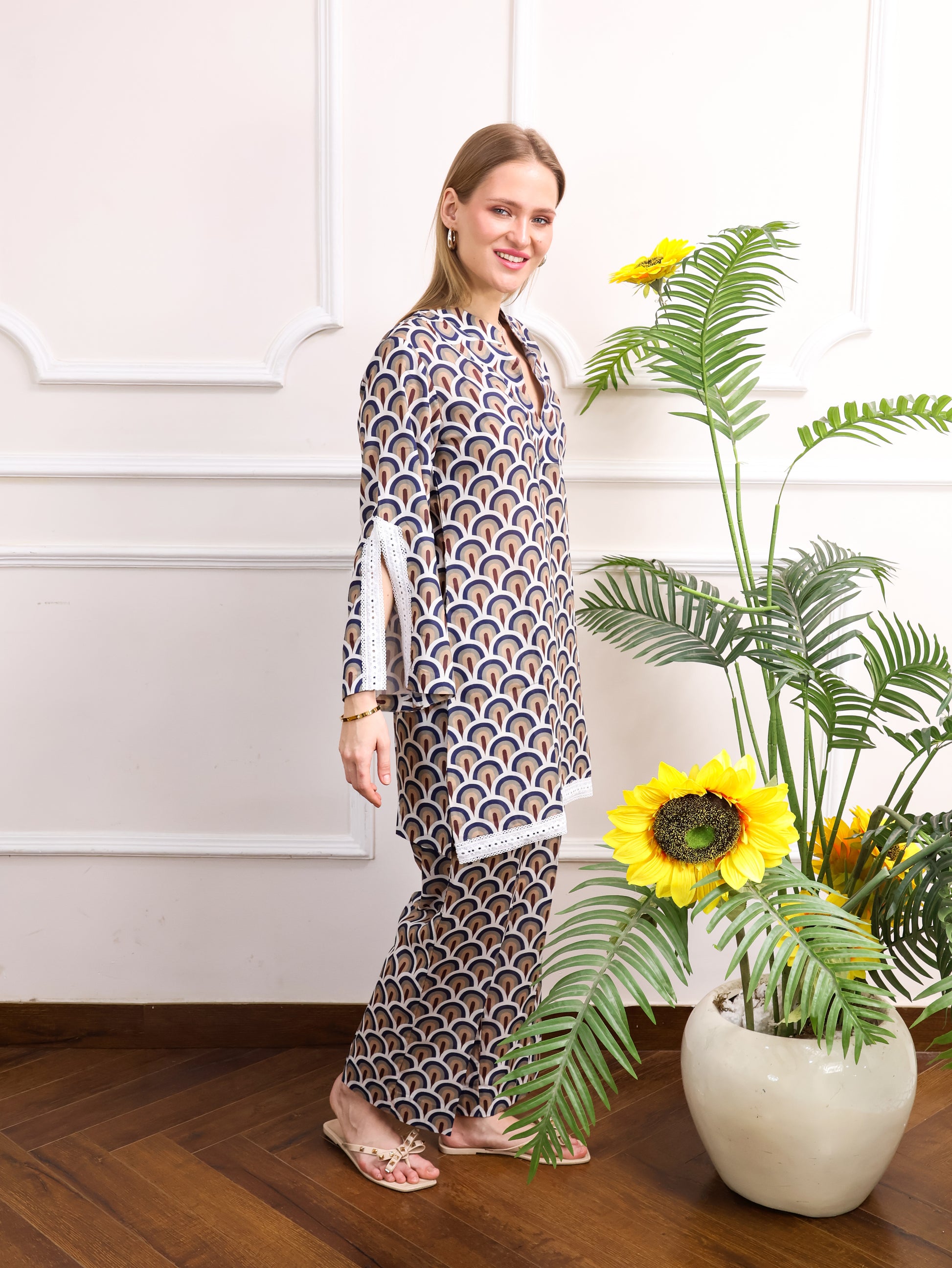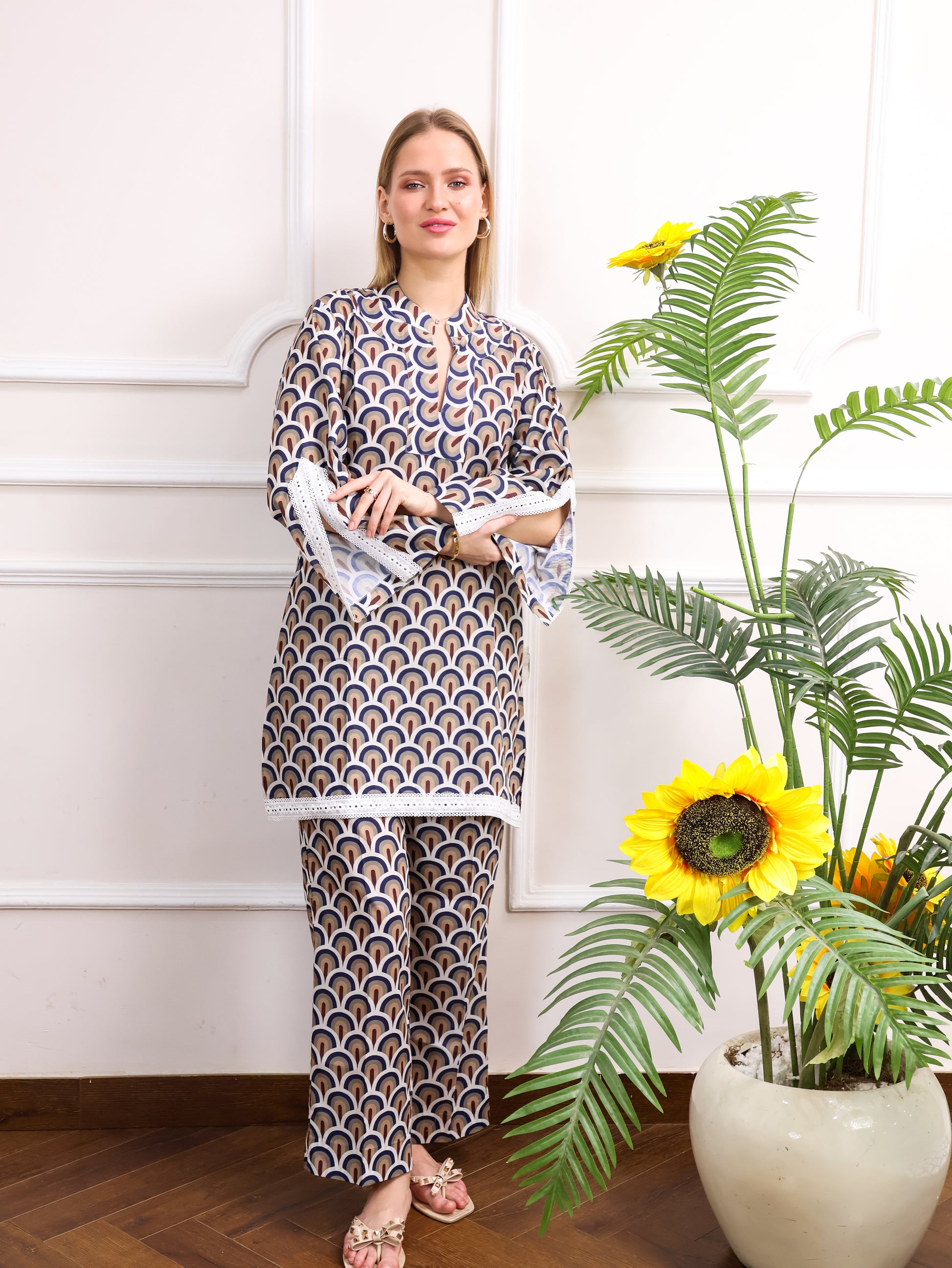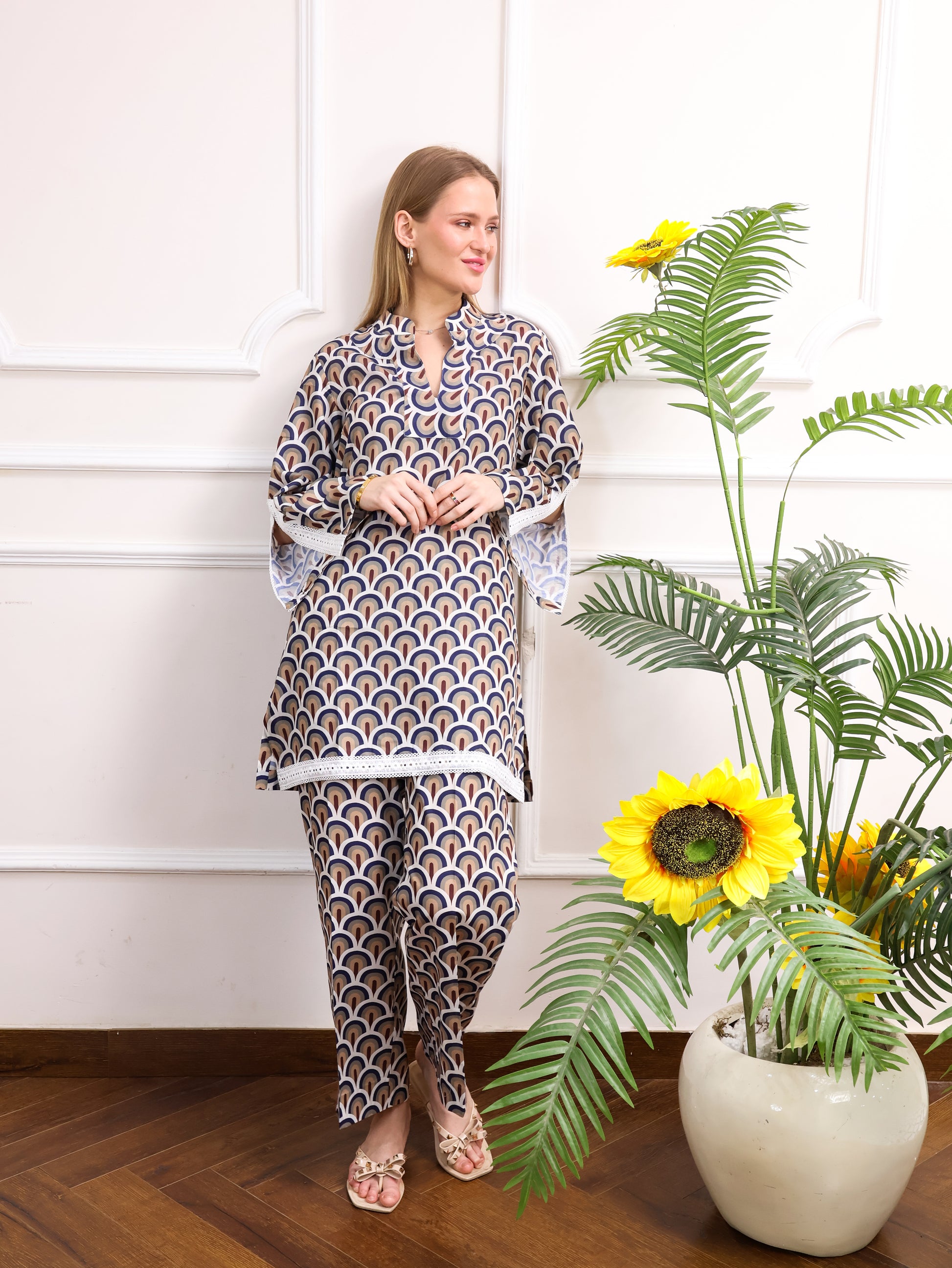 This Japanese cotton printed co-ord set features a beautiful, intricate design paired with delicate cut lace sleeves for a feminine touch. The soft cotton fabric ensures comfort, while the stylish print adds a unique flair. Perfect for casual outings or laid-back occasions with a touch of elegance.