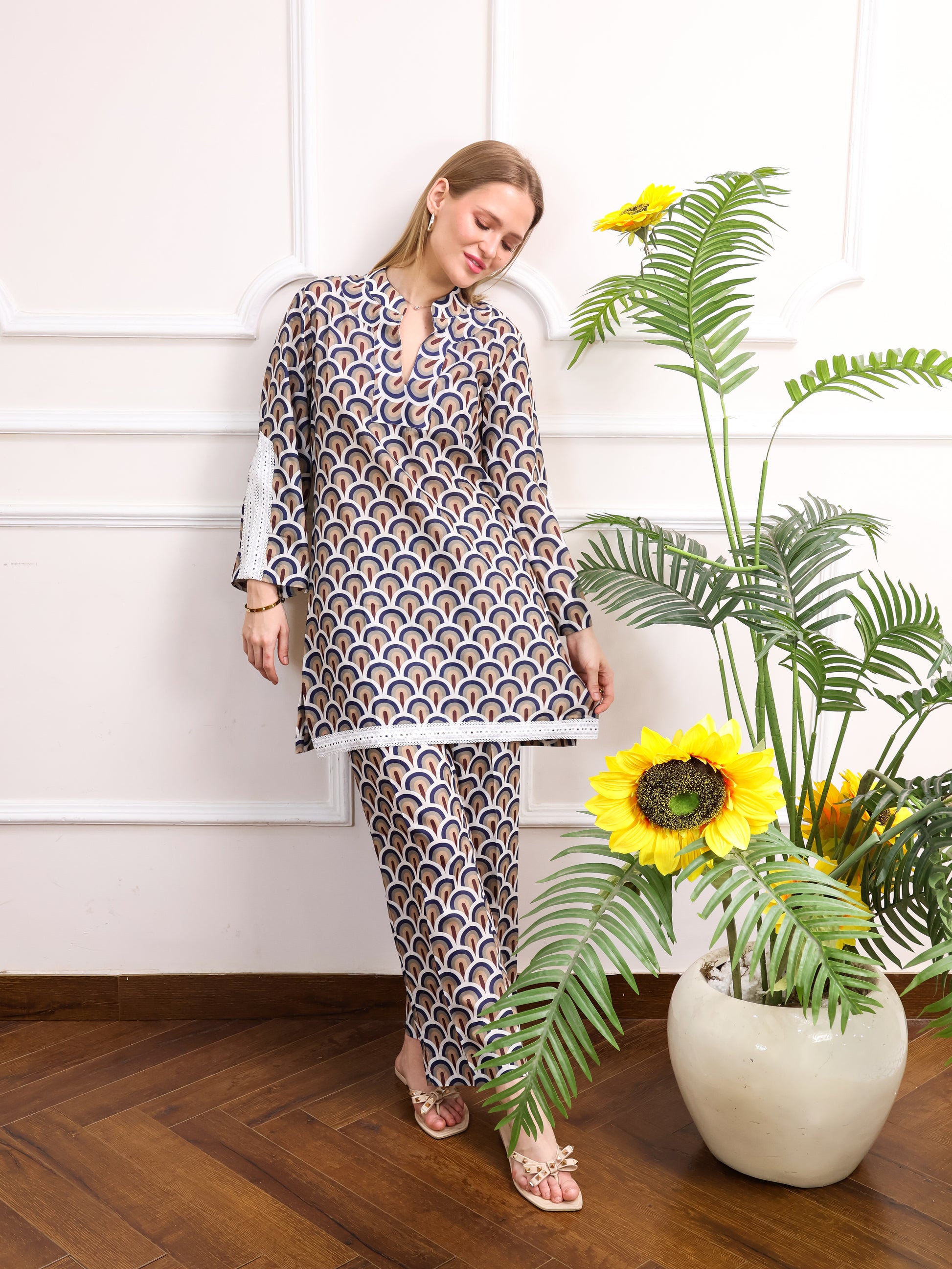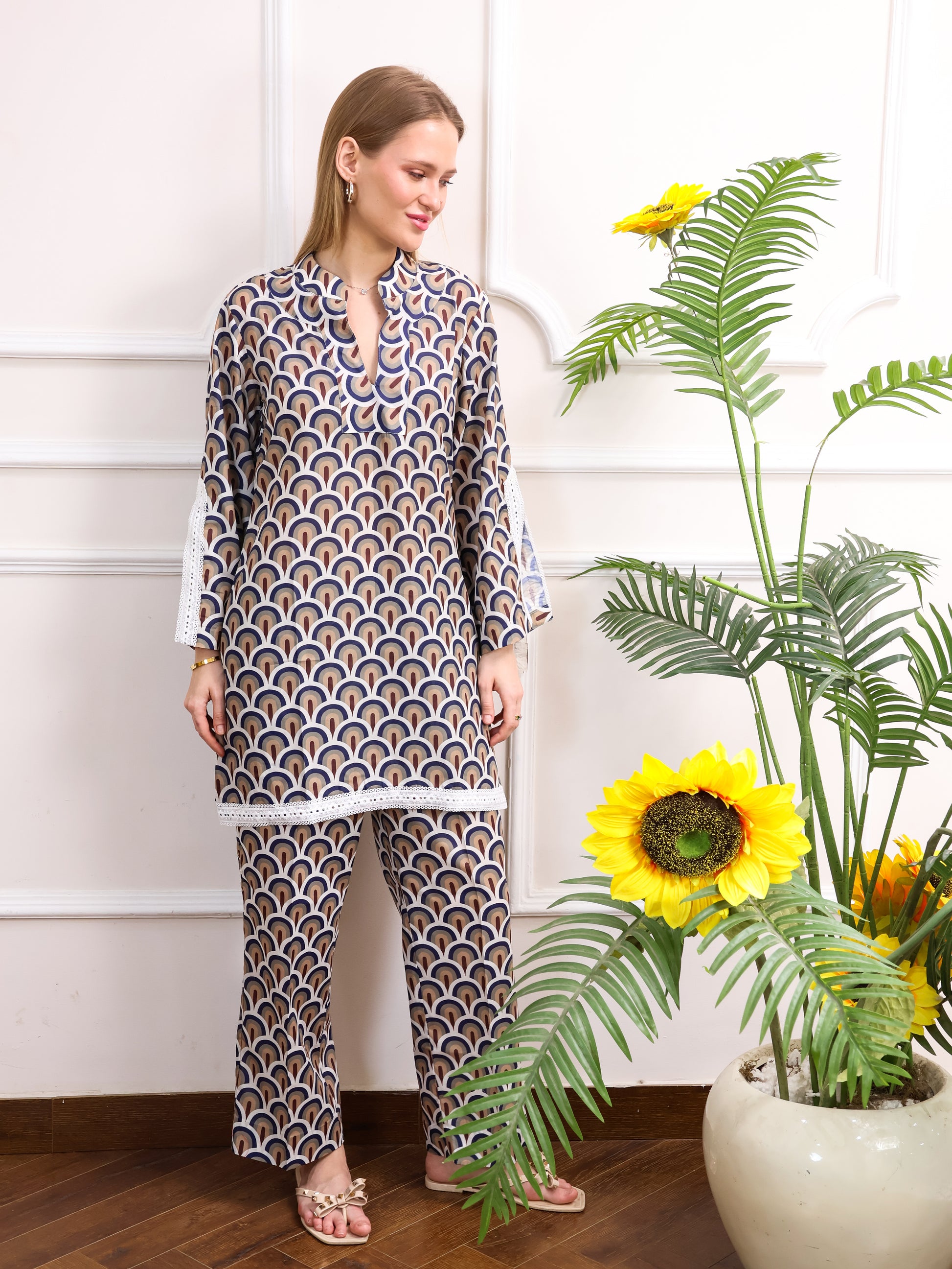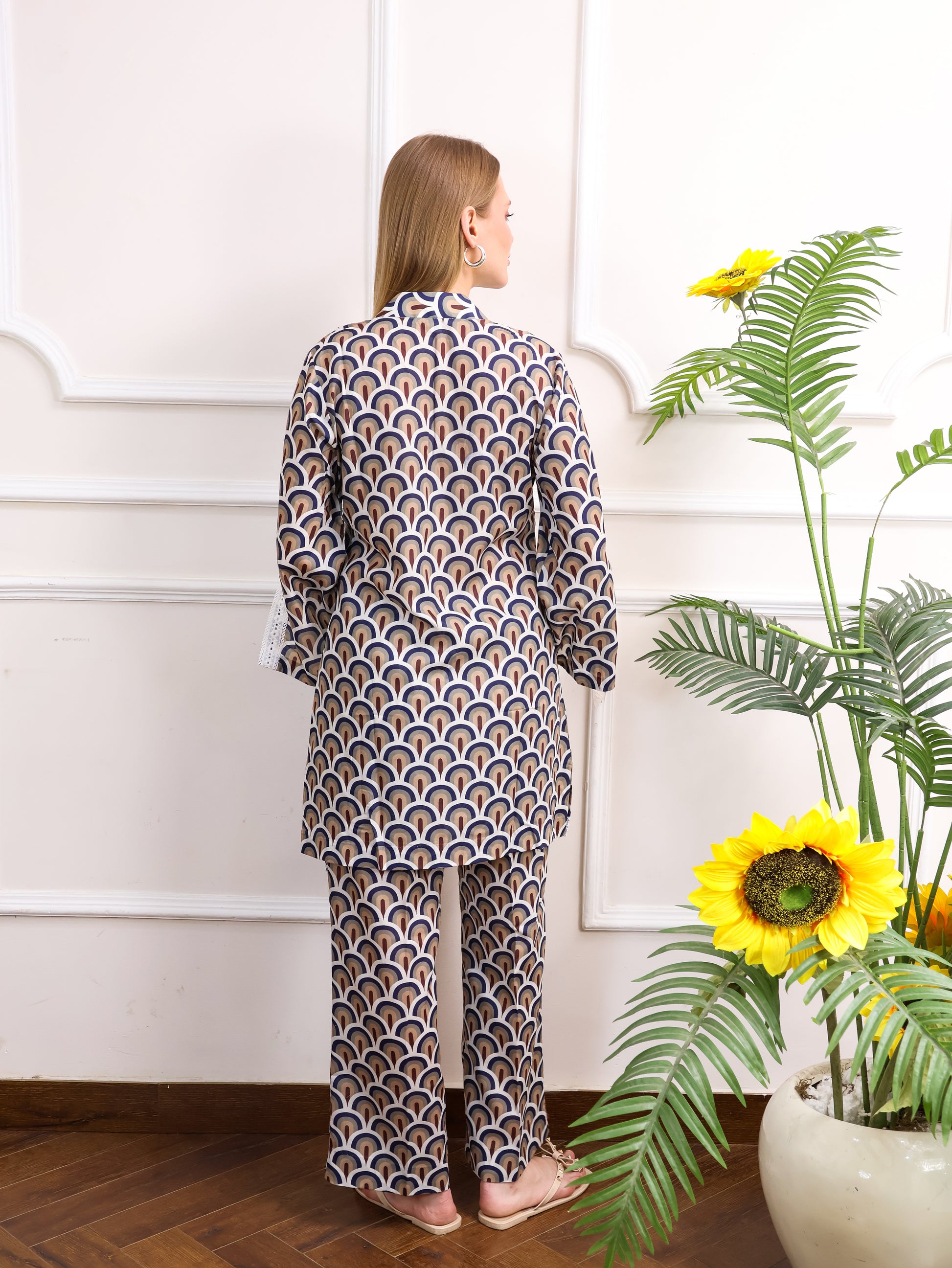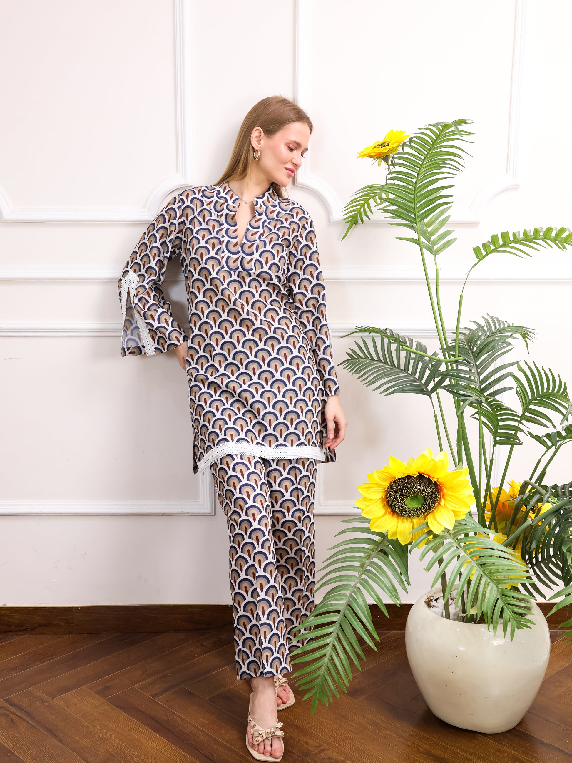 This Japanese cotton printed co-ord set features a beautiful, intricate design paired with delicate cut lace sleeves for a feminine touch. The soft cotton fabric ensures comfort, while the stylish print adds a unique flair. Perfect for casual outings or laid-back occasions with a touch of elegance.