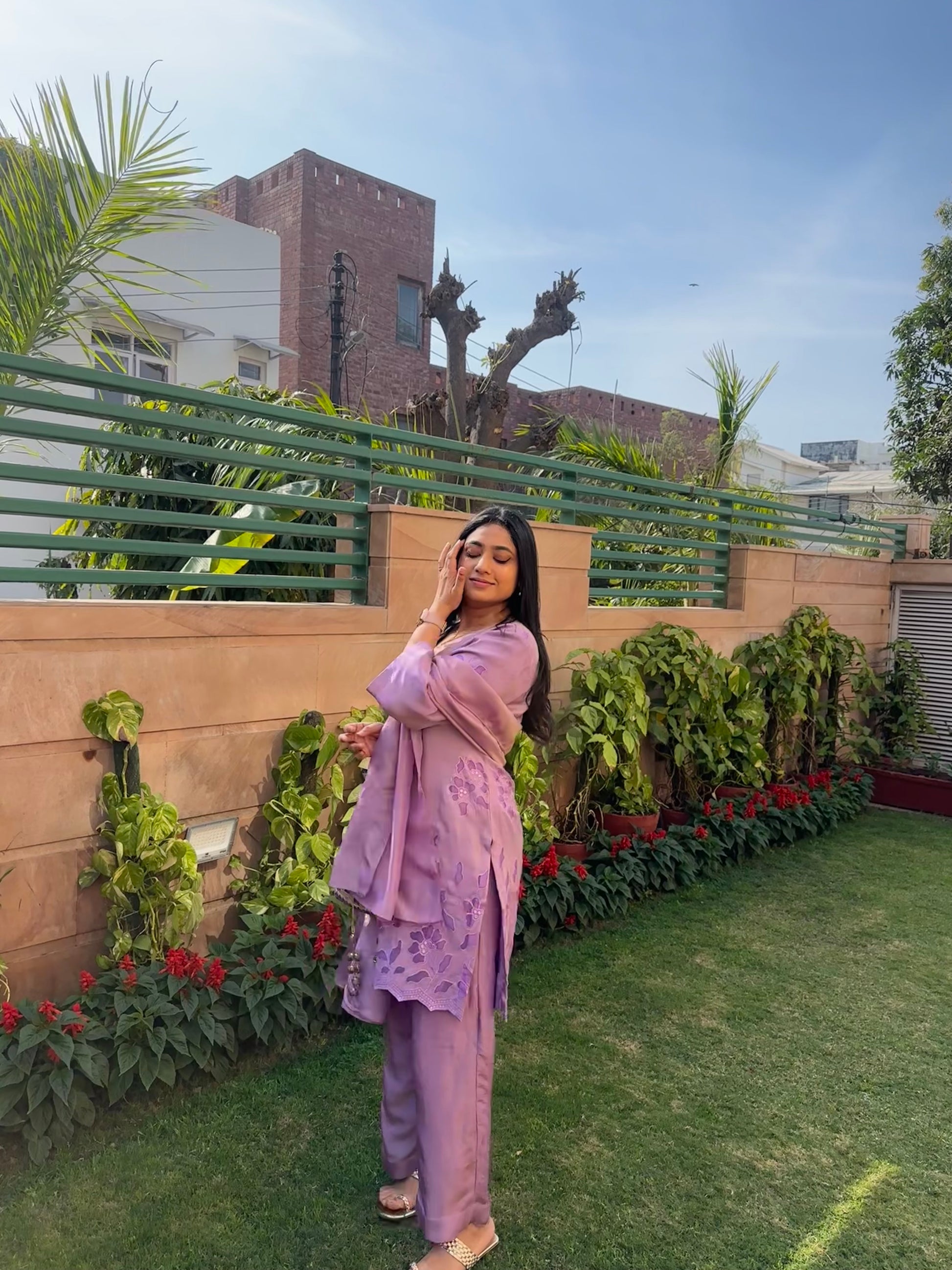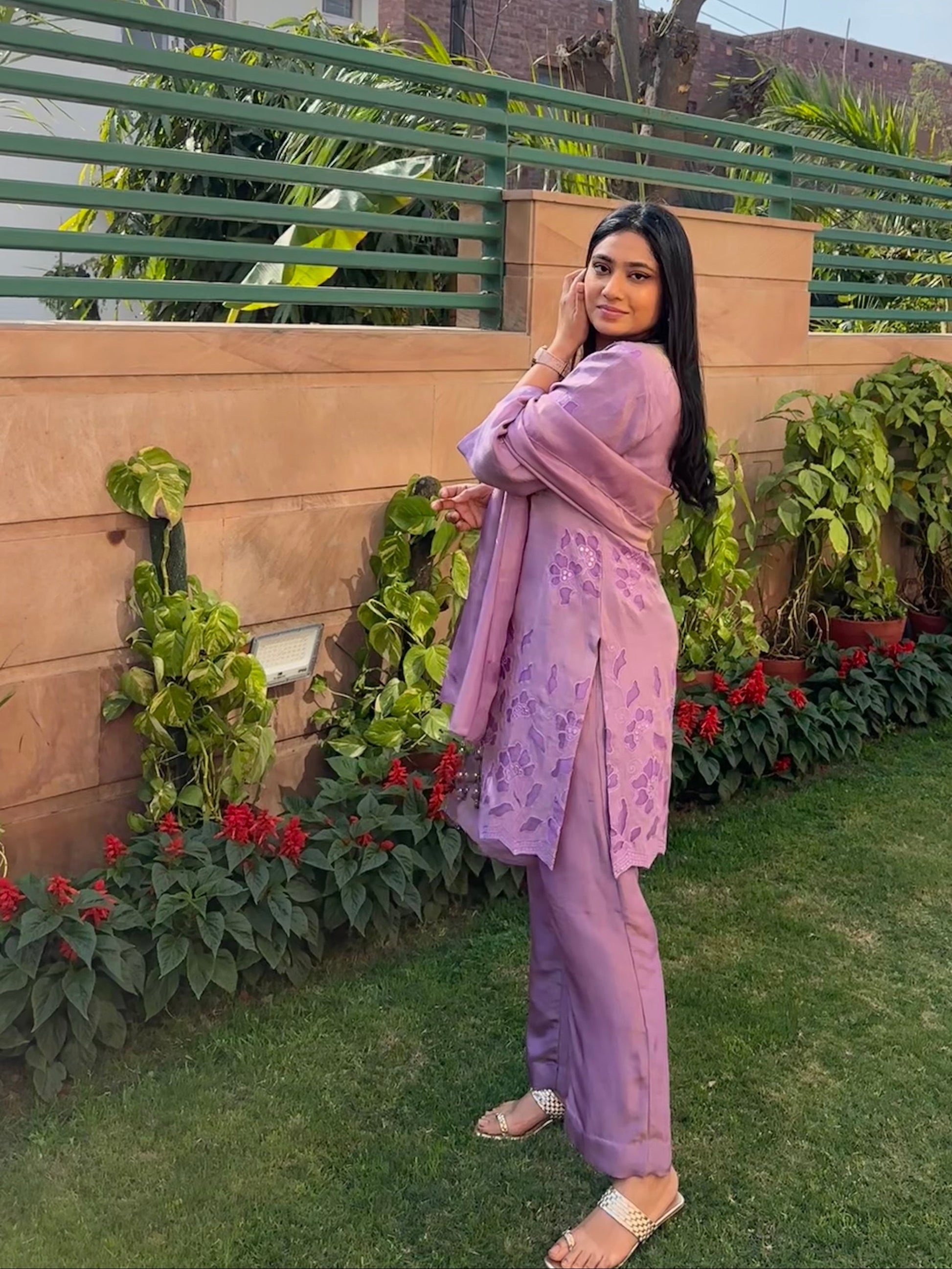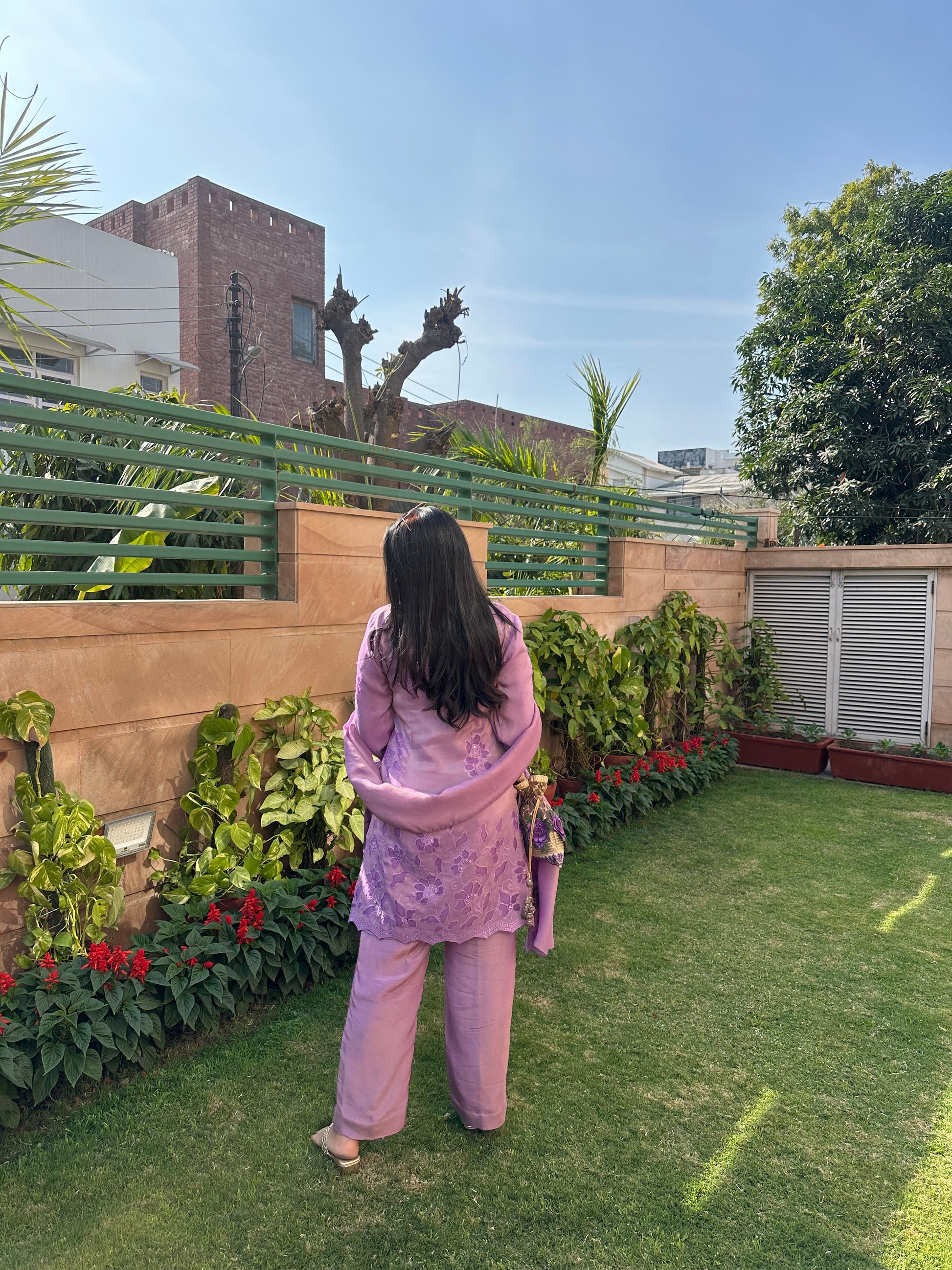 A graceful lavender tissue kurta accented with subtle sequin detailing on the front, paired with plain tissue pants and a matching dupatta. Lightweight, luminous, and effortlessly elegant perfect for refined festive moments and intimate celebrations