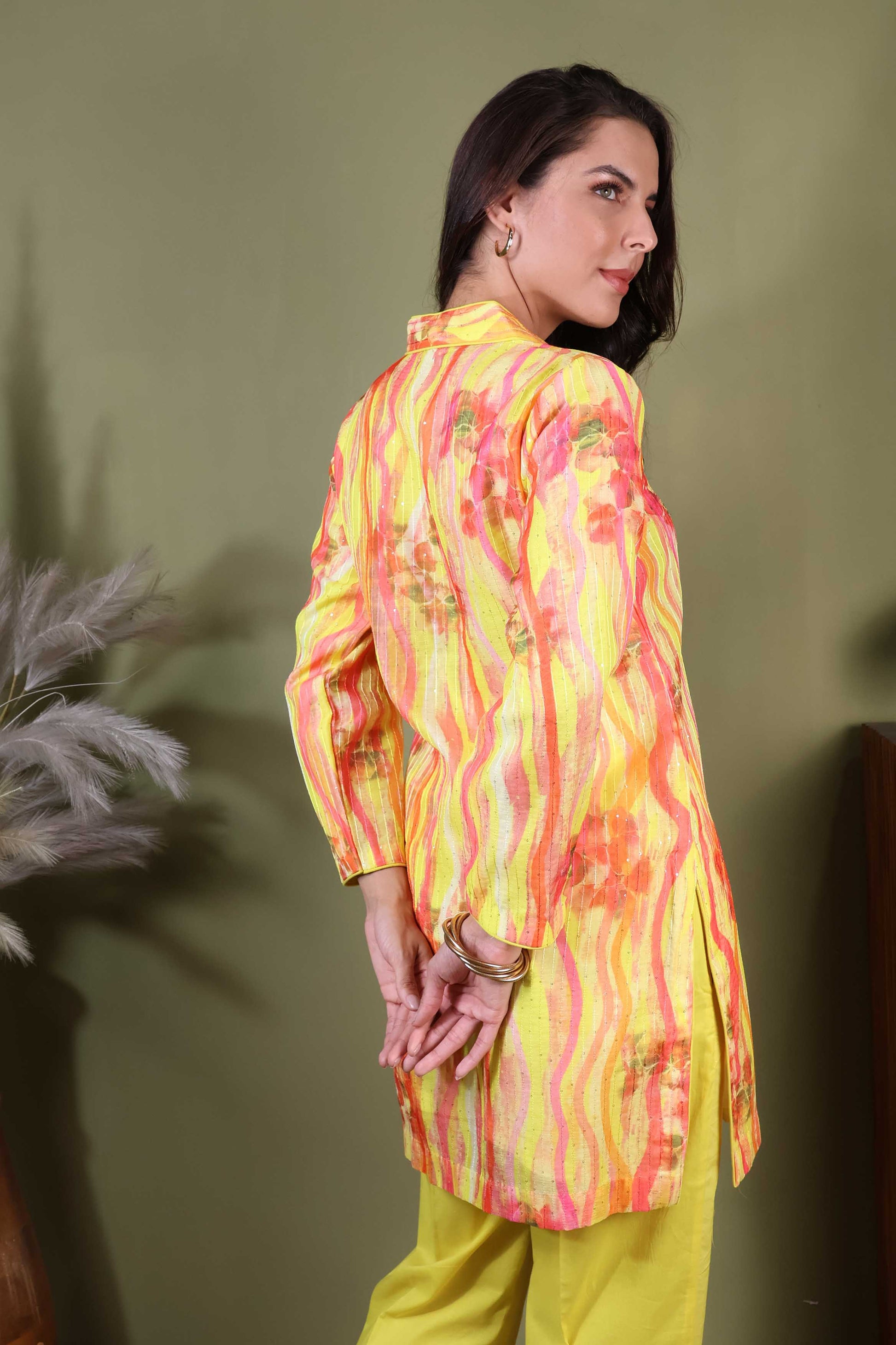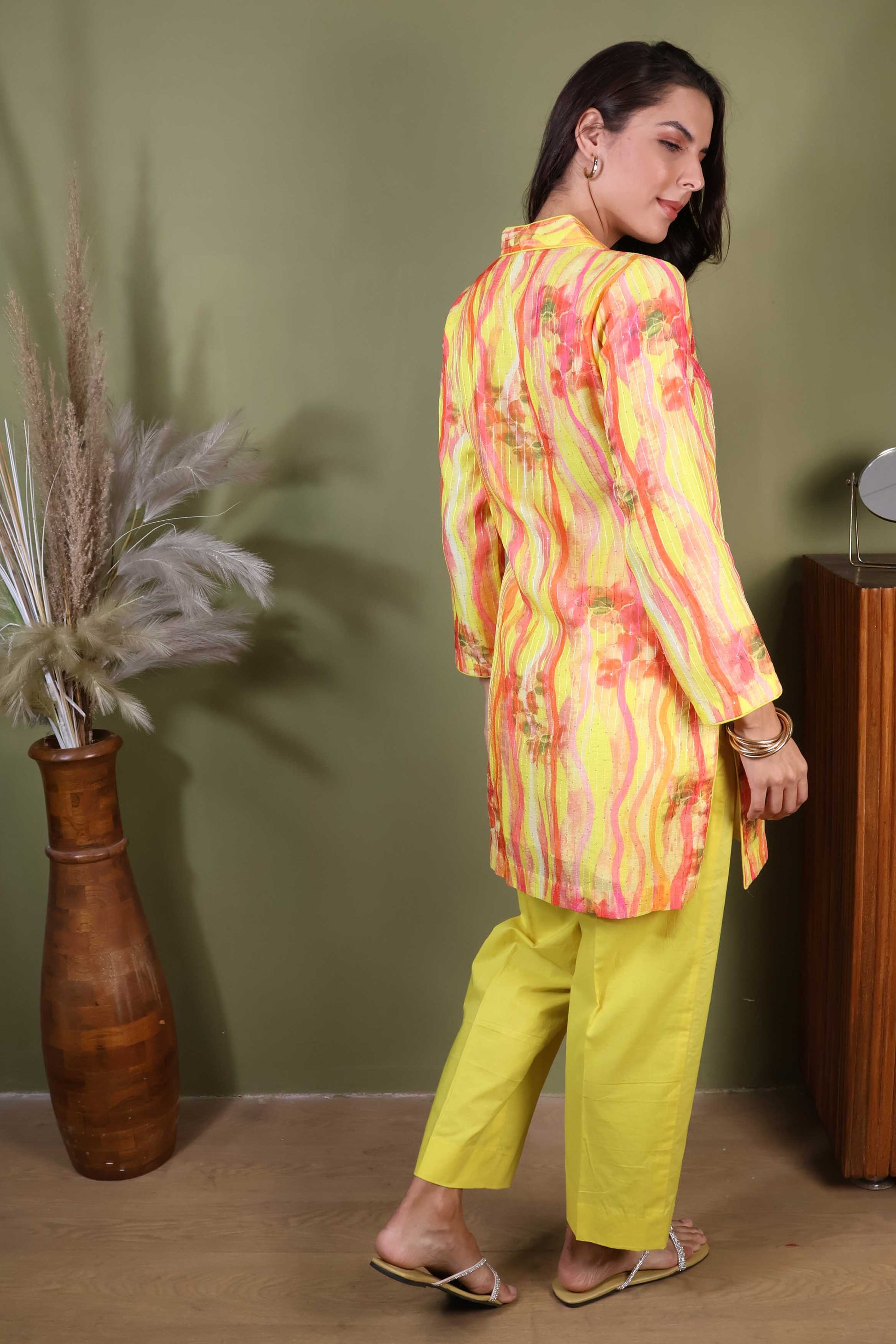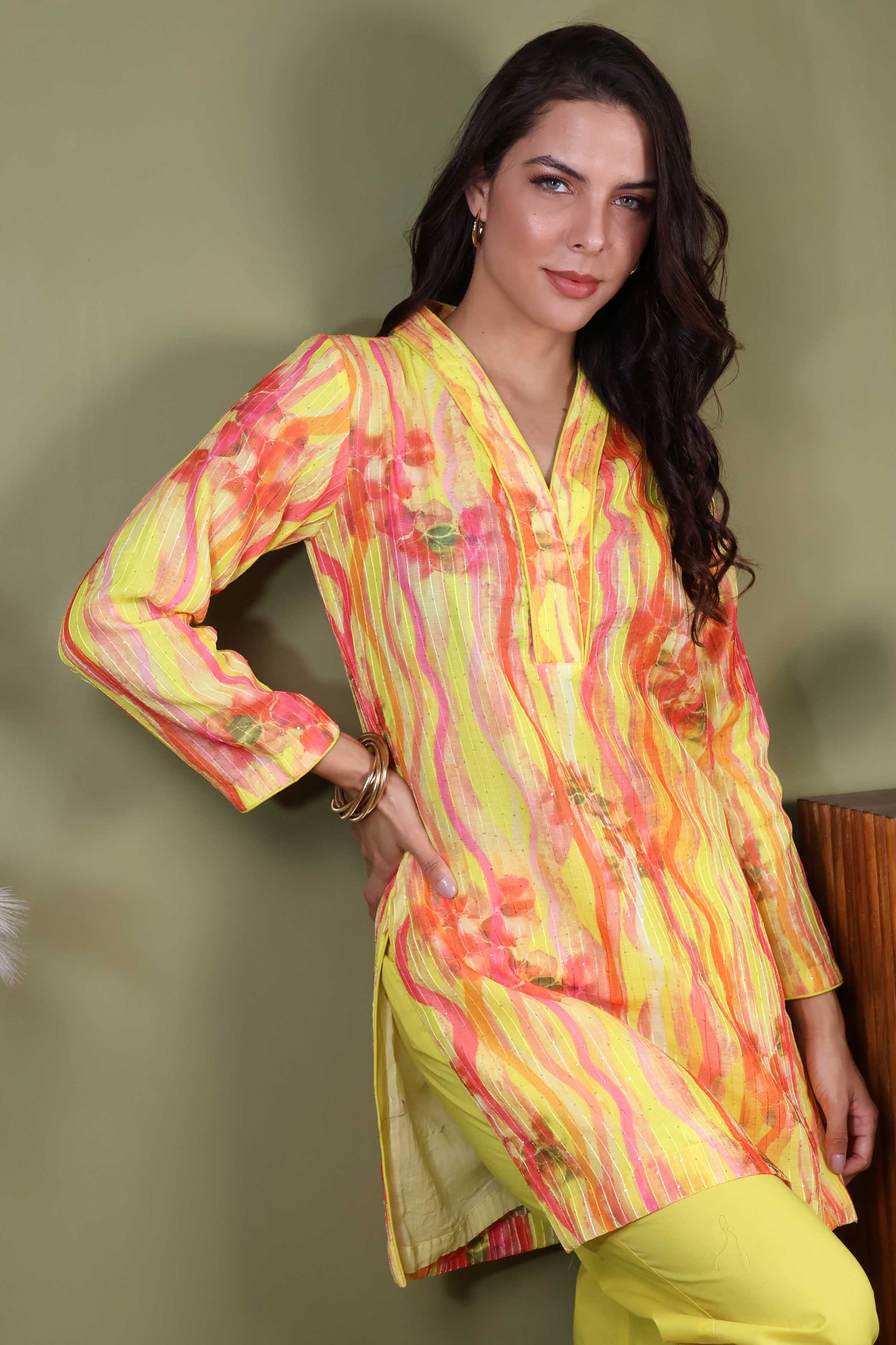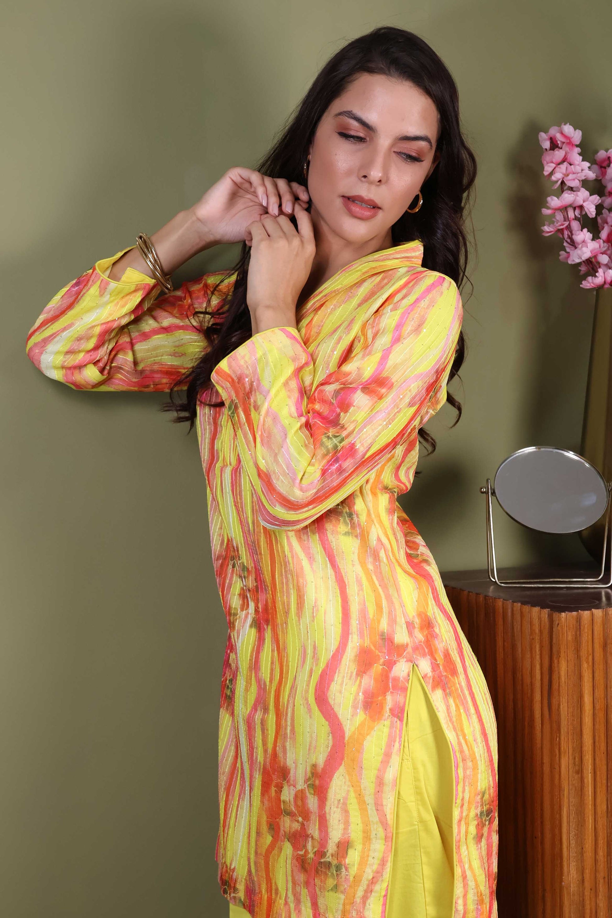 A light yellow Chanderi kurta with cotton pants set sounds lovely! The Chanderi fabric gives the kurta a delicate sheen and a lightweight feel. Light yellow will offer a soft, fresh look that's ideal for daytime events or casual gatherings. The kurta features subtle embellishments to enhance its elegance. Paired with cotton pants, the outfit will be comfortable and breathable. Cotton pants will keep the look relaxed and easy-going, complementing the sophistication of the Chanderi kurta.