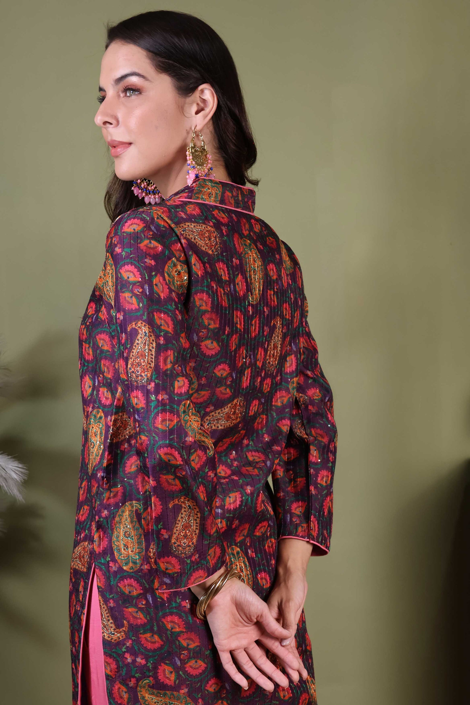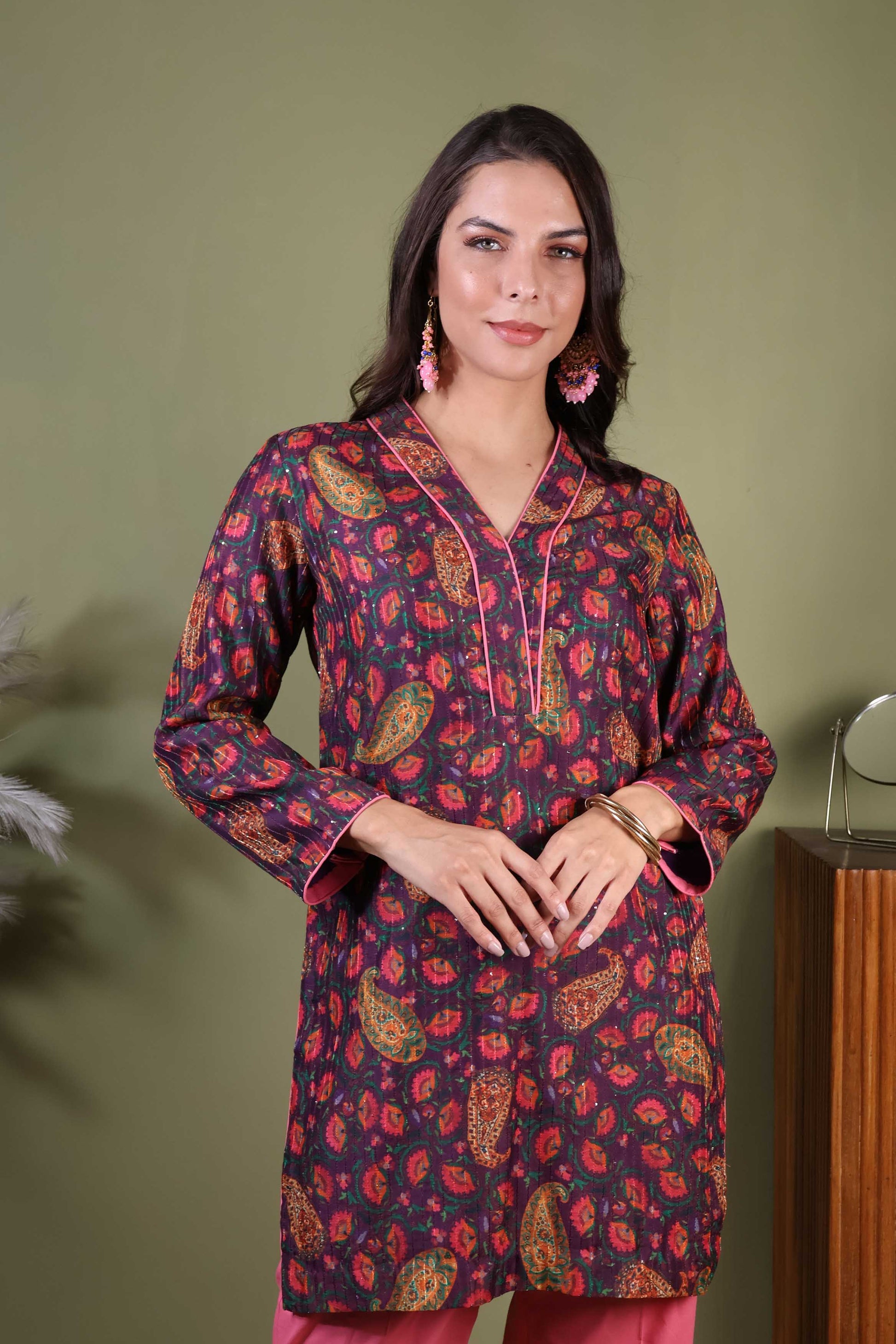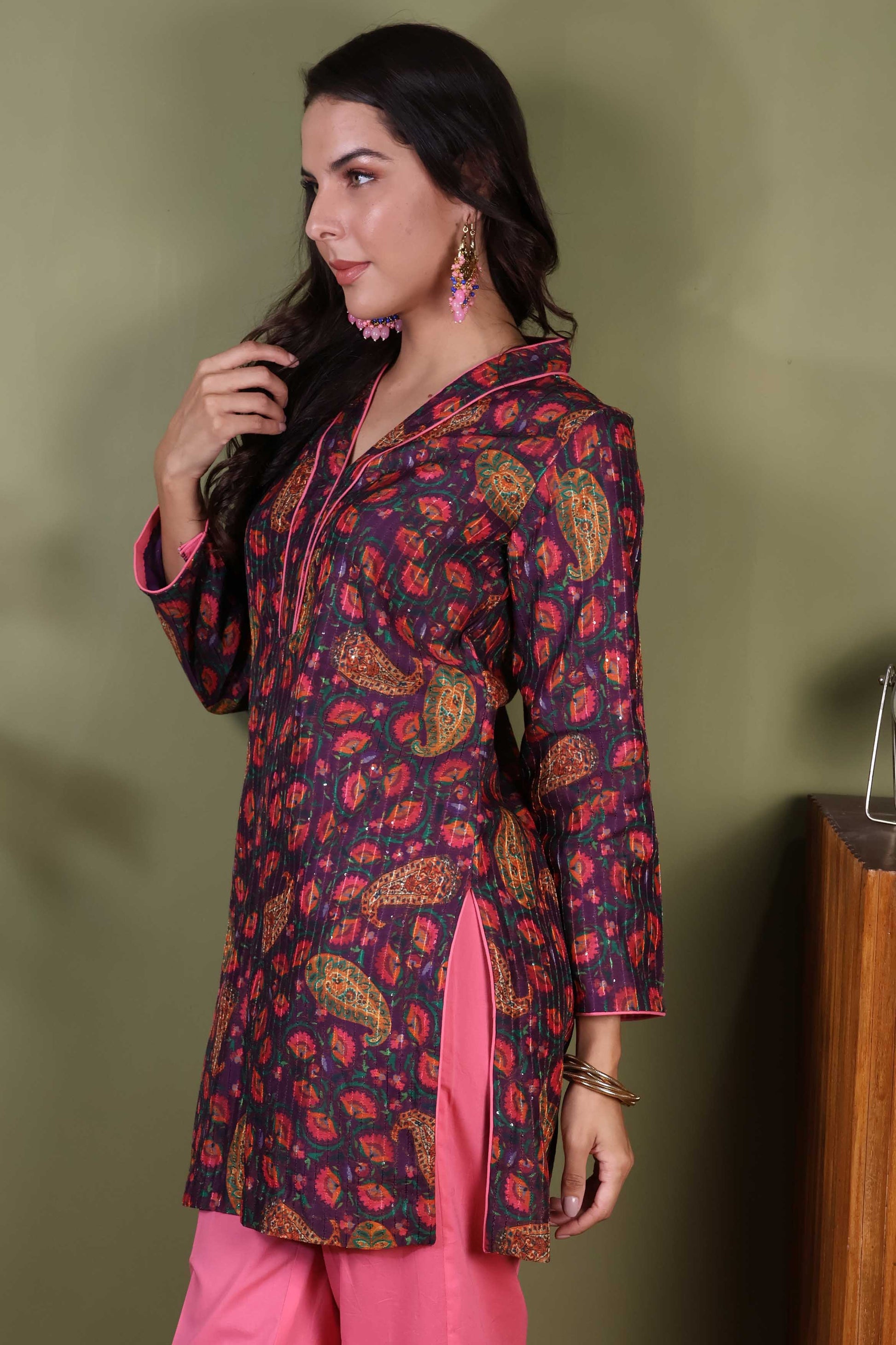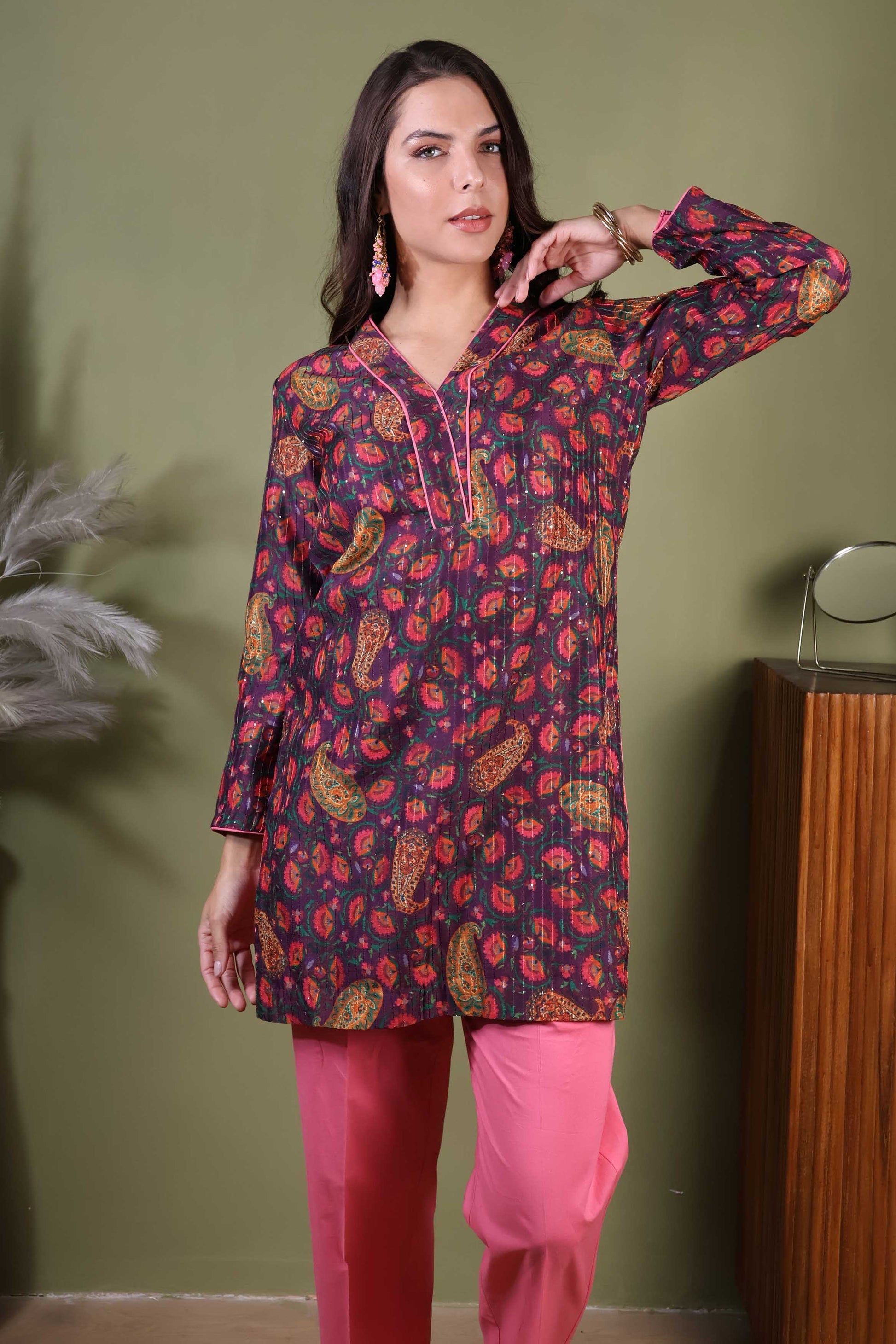 A mauve short kurta and pant set in Chanderi with cotton pants sounds both elegant and comfortable!Chanderi fabric gives the kurta a light, airy feel with a subtle sheen, adding sophistication. Mauve is a soft, muted shade that adds a touch of elegance while remaining understated. A short kurta typically offering a modern, chic look. It features delicate patterns in a complementary pink shade, enhancing the overall appeal. Cotton pants will provide comfort and breathability, balancing the luxurious feel of Chanderi. These will likely be simple and streamlined, allowing the kurta to be the focal point. They are in a pink shade to keep the look cohesive and relaxed.