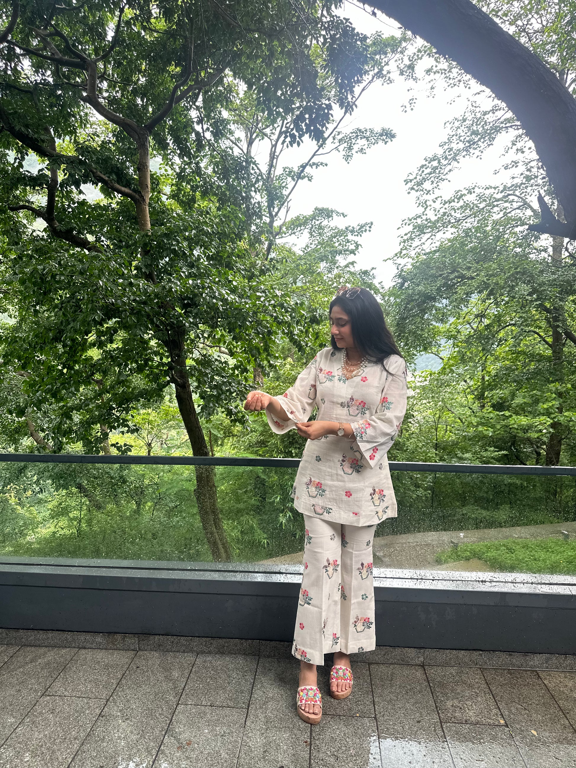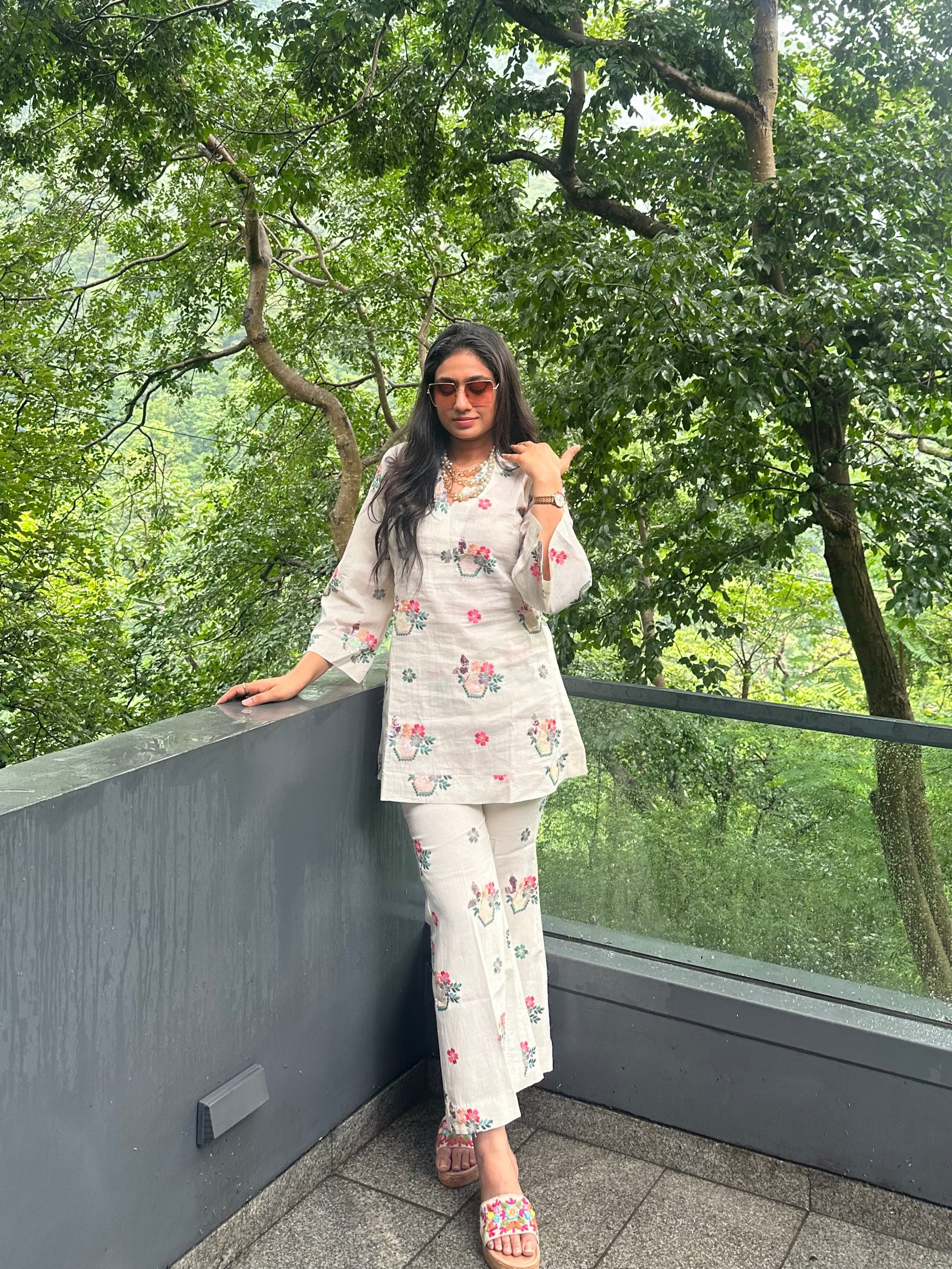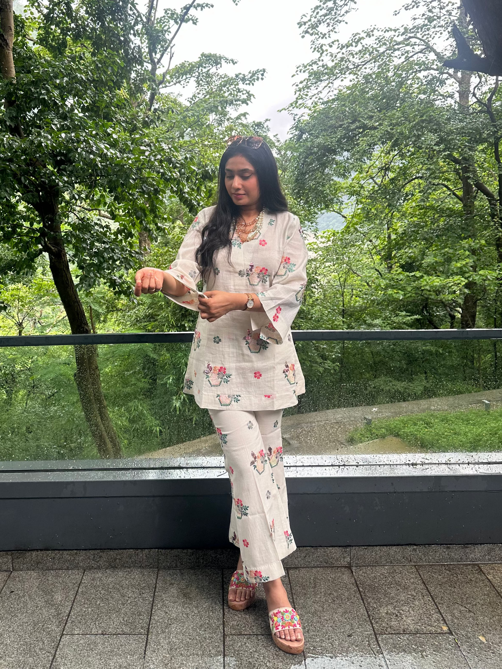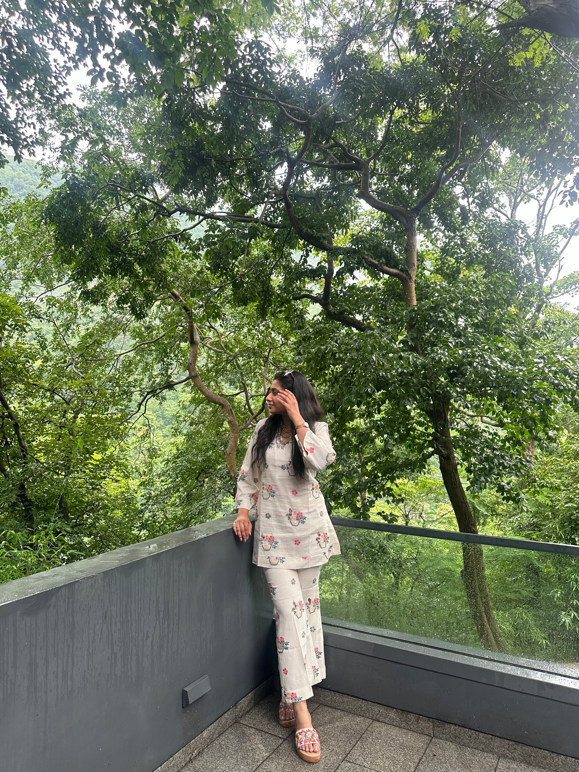 Elegant Off-white cutwork multi color embroidery kurta set featuring intricate detailing, paired with comfortable plazos. Perfect blend of tradition and modern style, ideal for festive occasions or casual ethnic wear.
