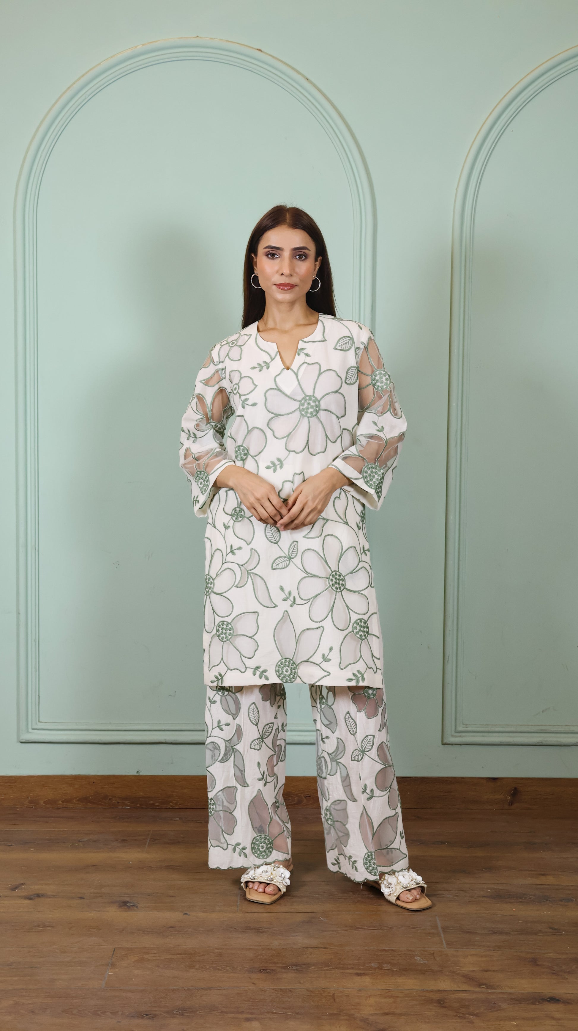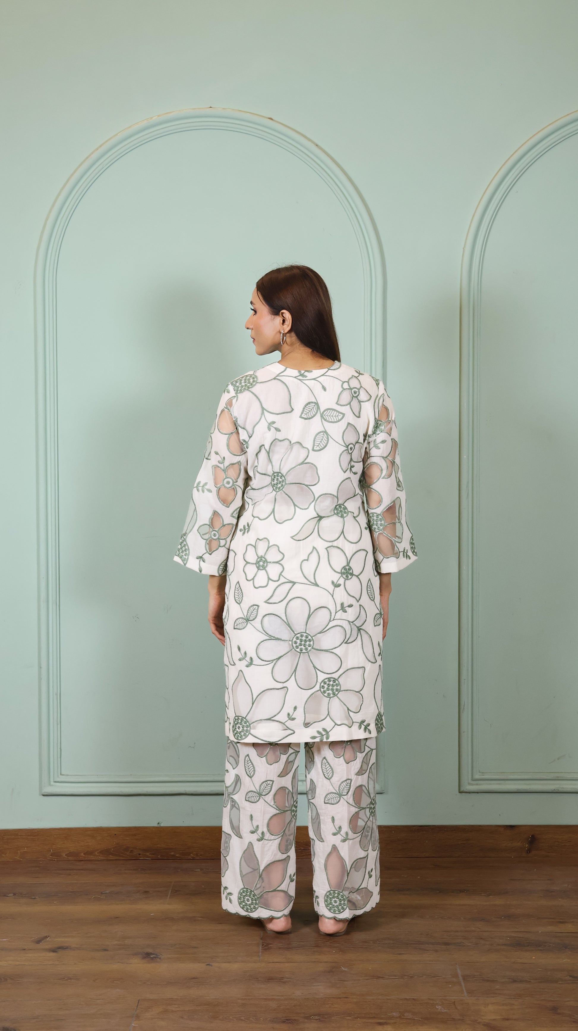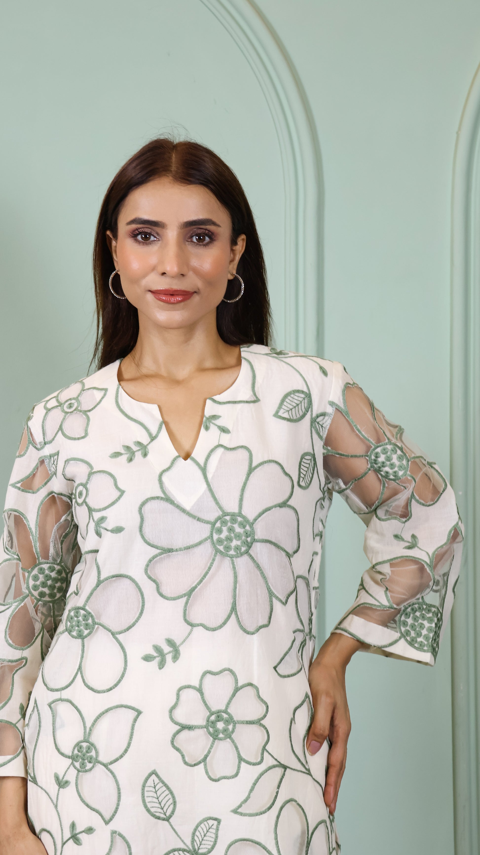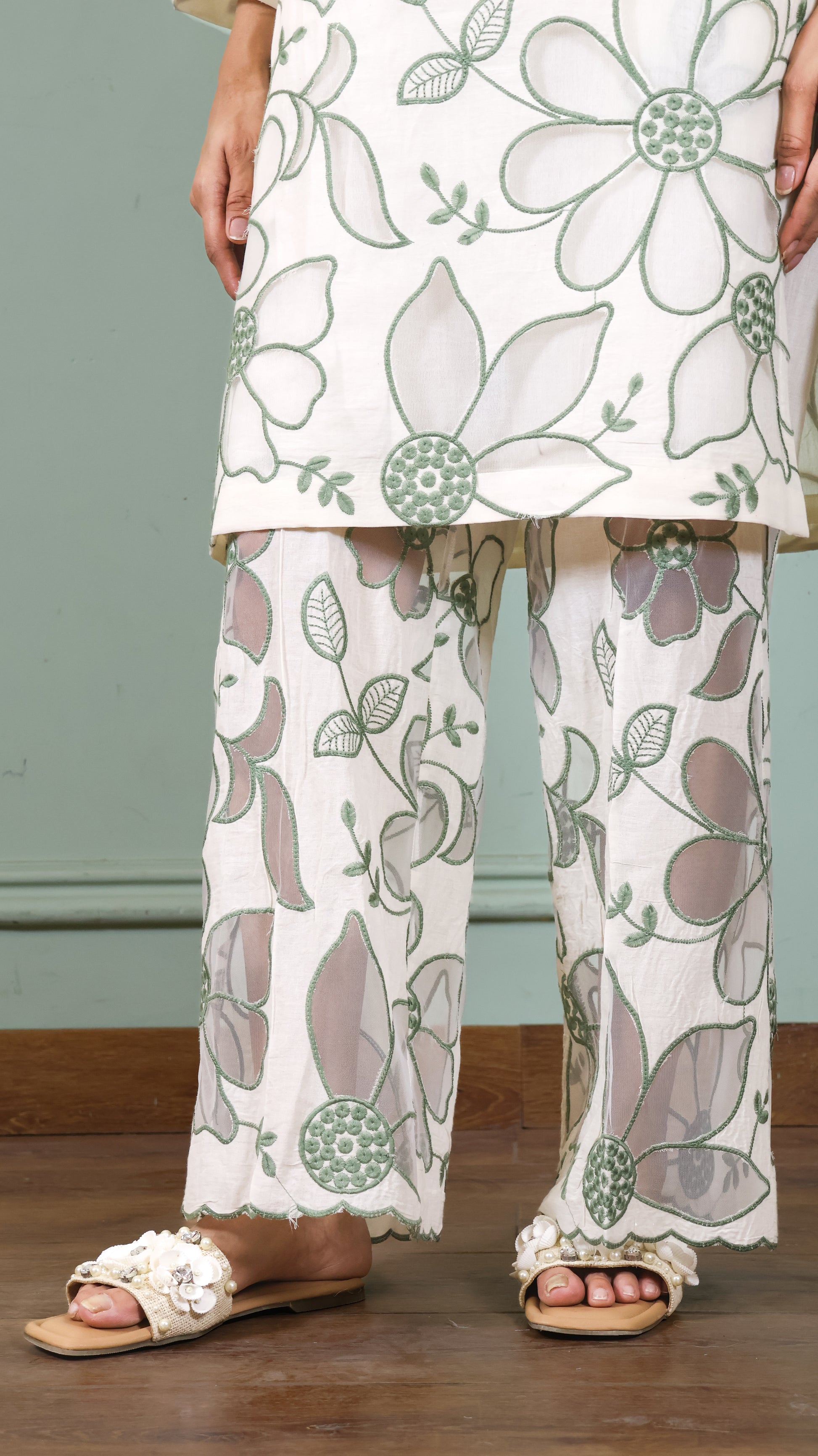 Elegant Off-white cutwork green kurta set featuring intricate detailing, paired with comfortable plazos. Perfect blend of tradition and modern style, ideal for festive occasions or casual ethnic wear.