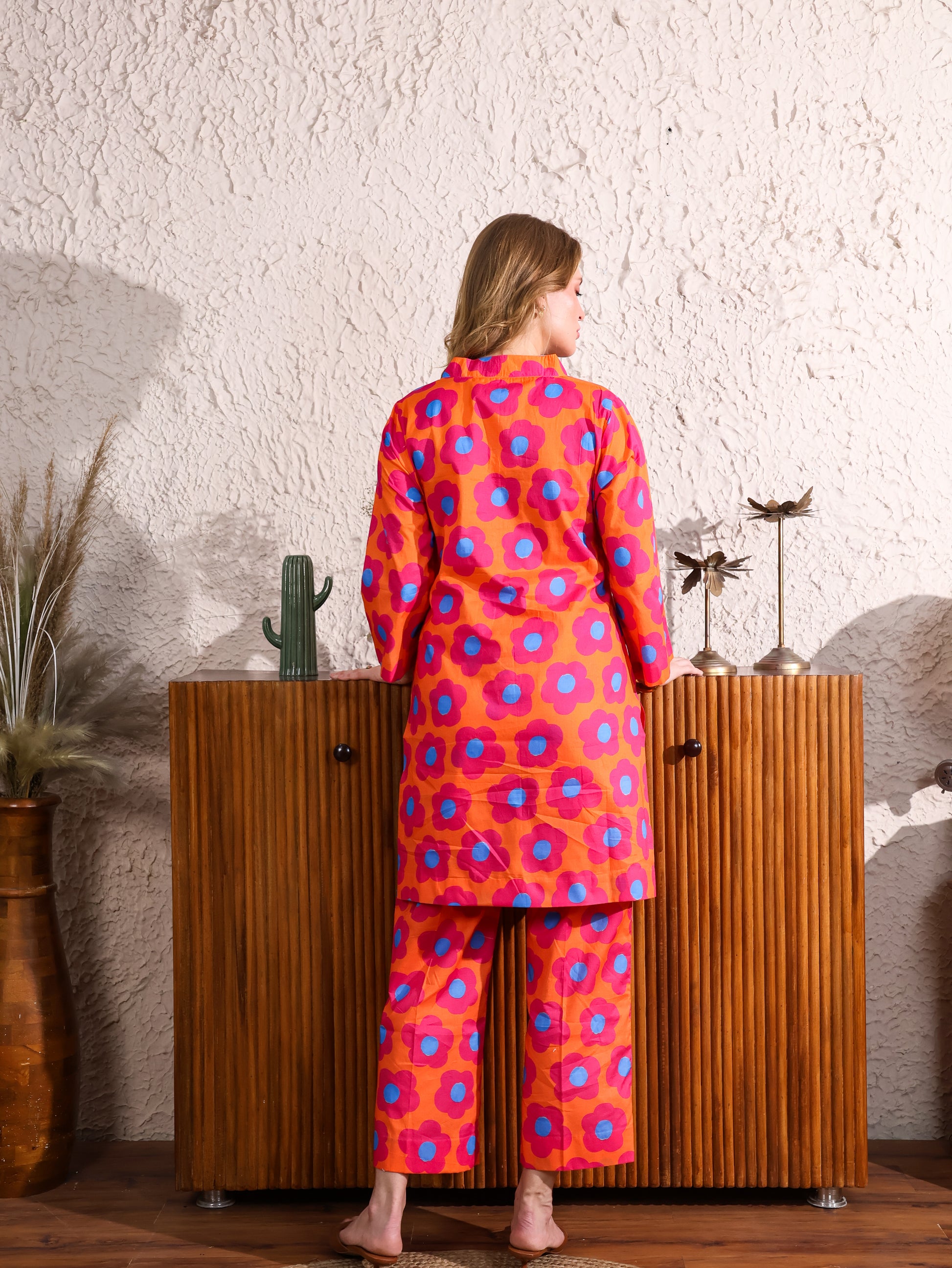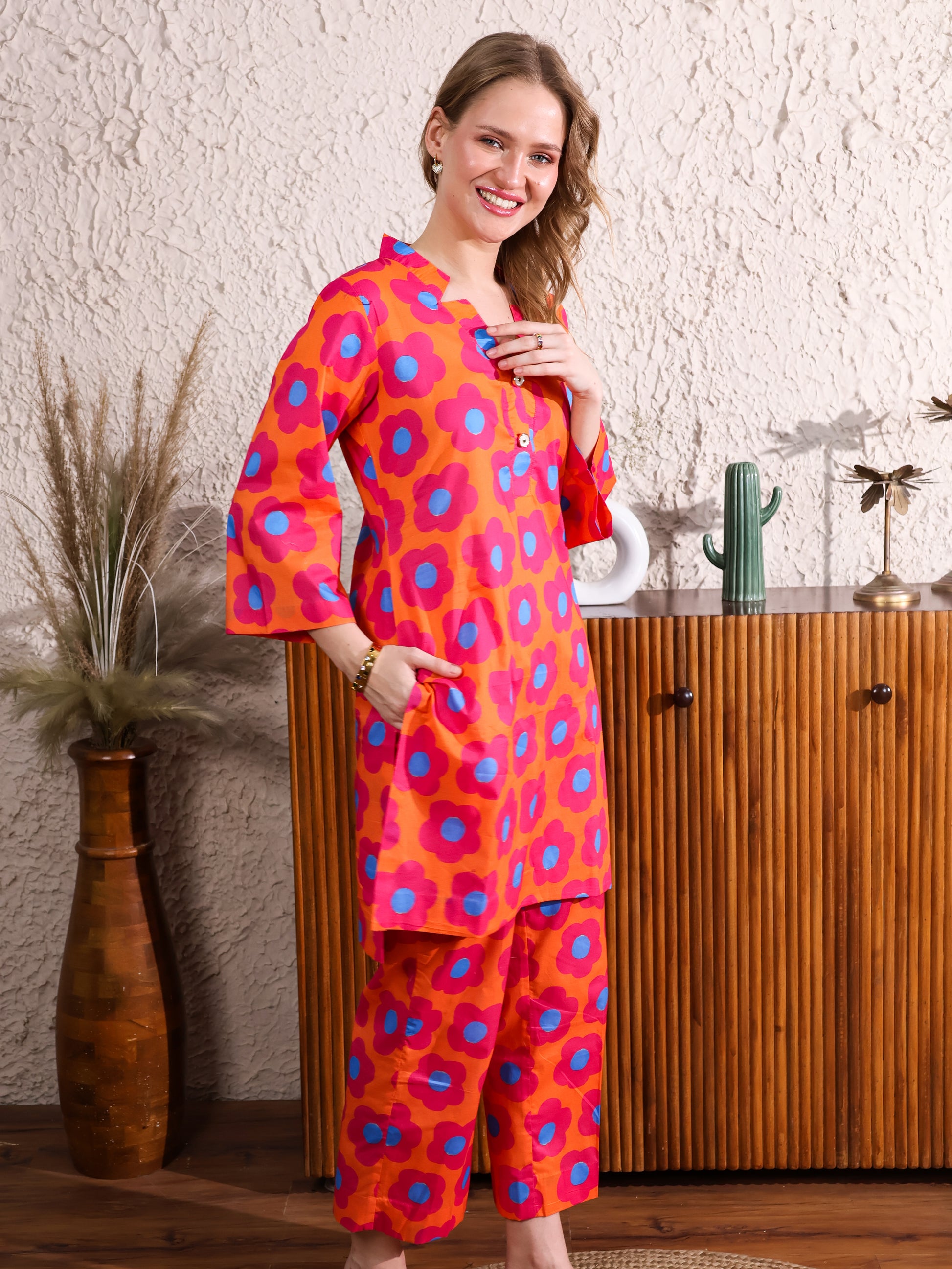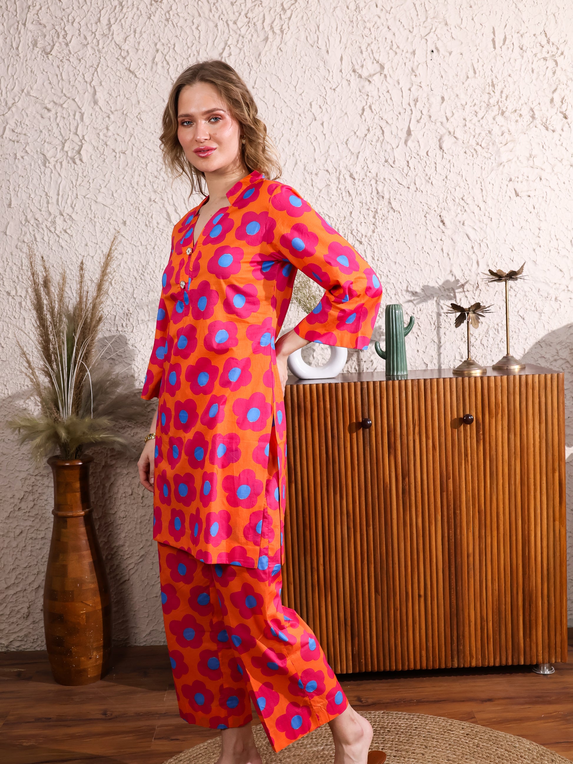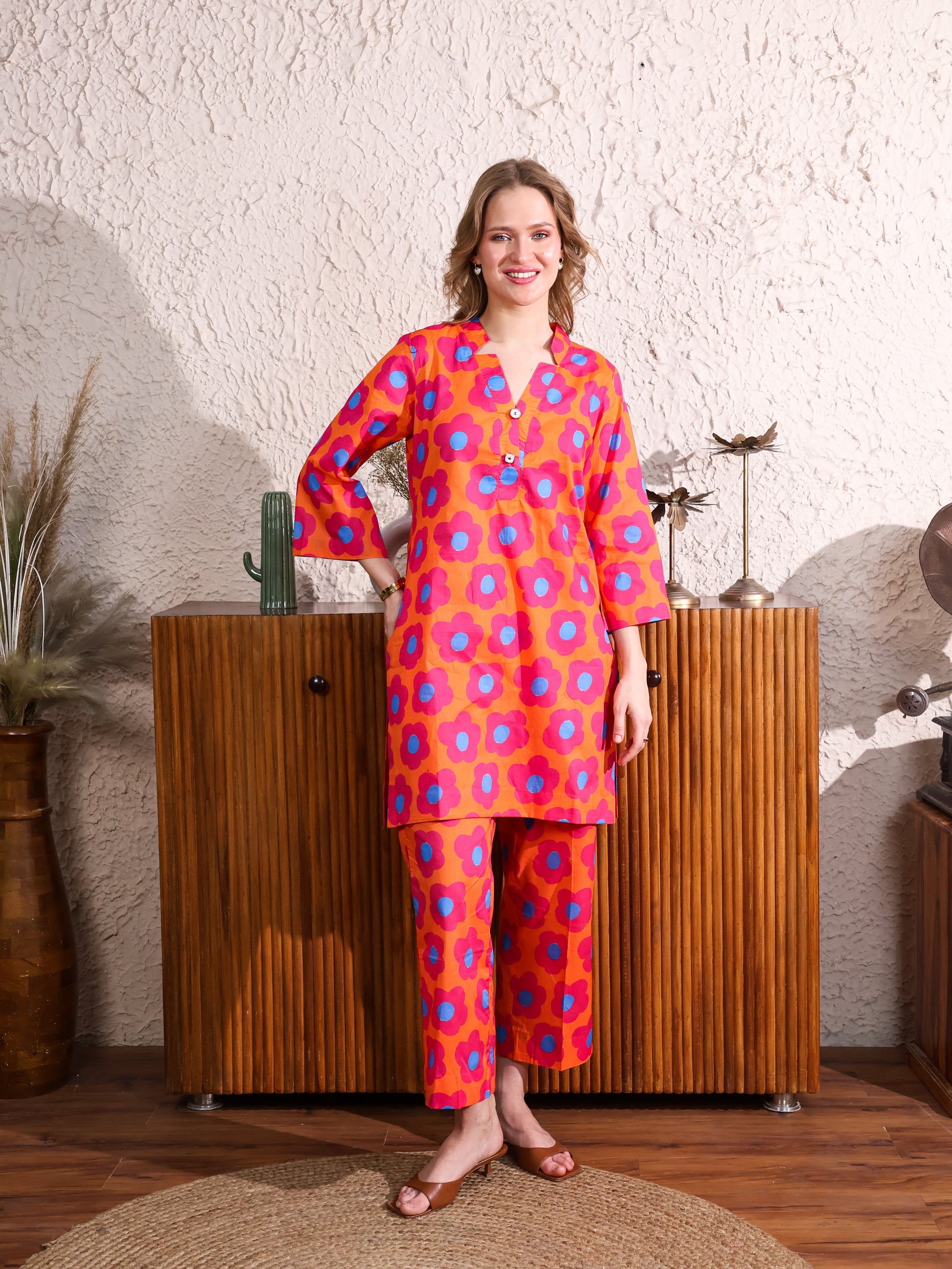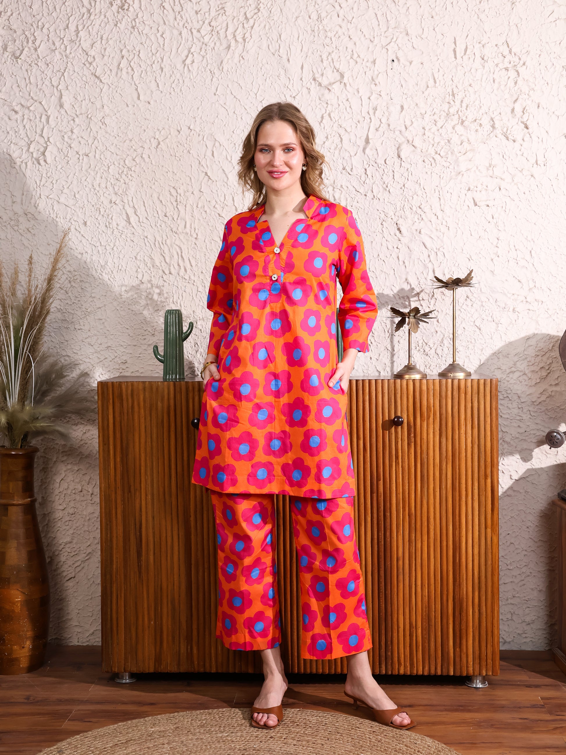 This Orange Floral Coordset features a vibrant floral print with a flattering V-neck top and straight-leg pants. The bright orange hue and playful pattern bring a lively, chic vibe, while the comfortable fit ensures all-day ease. Perfect for casual outings or laid-back gatherings, this set adds a fresh, stylish touch to your wardrobe.