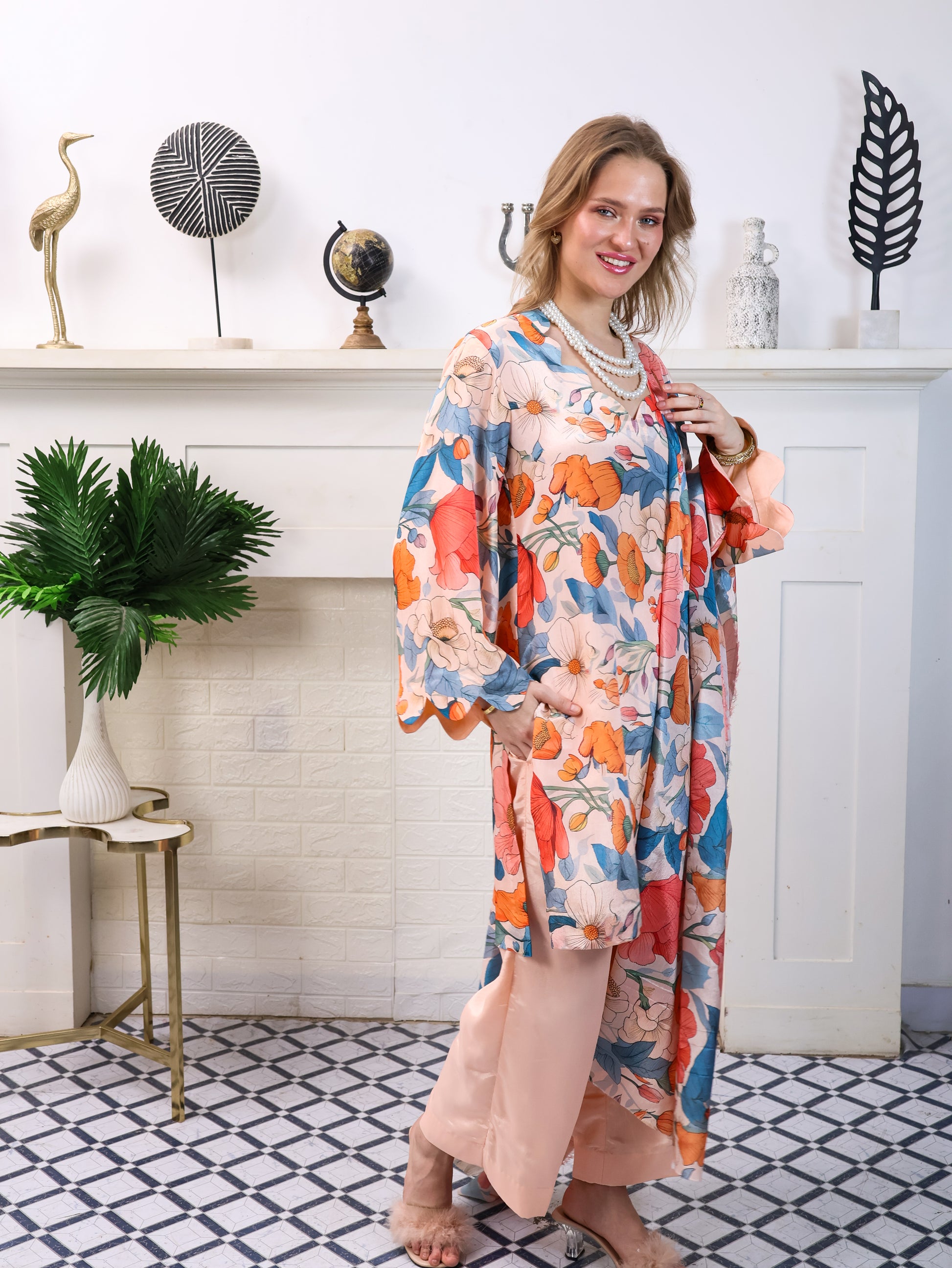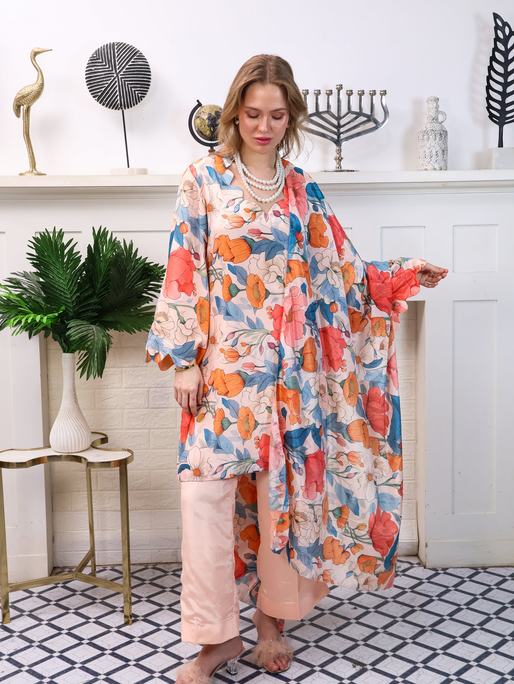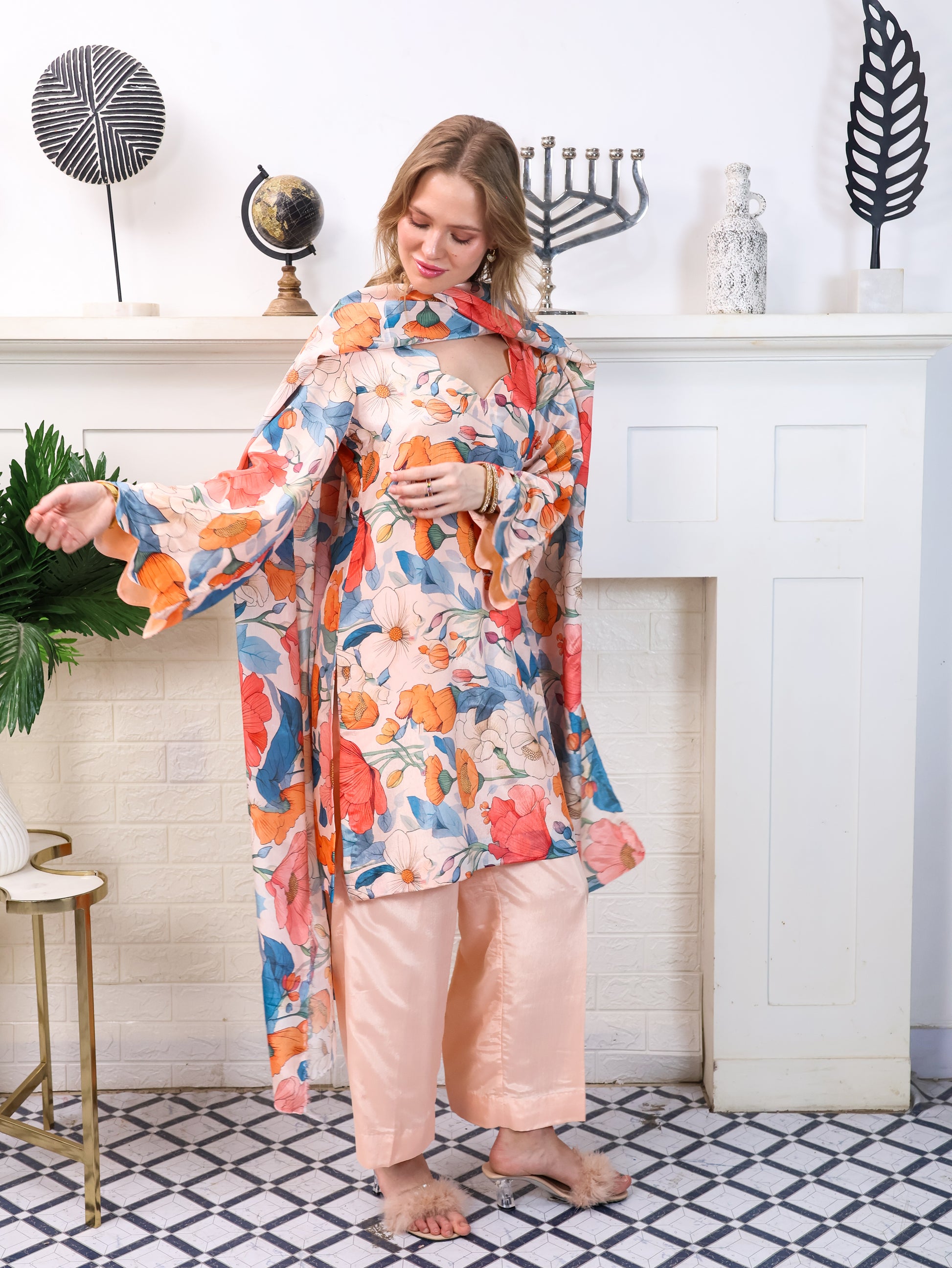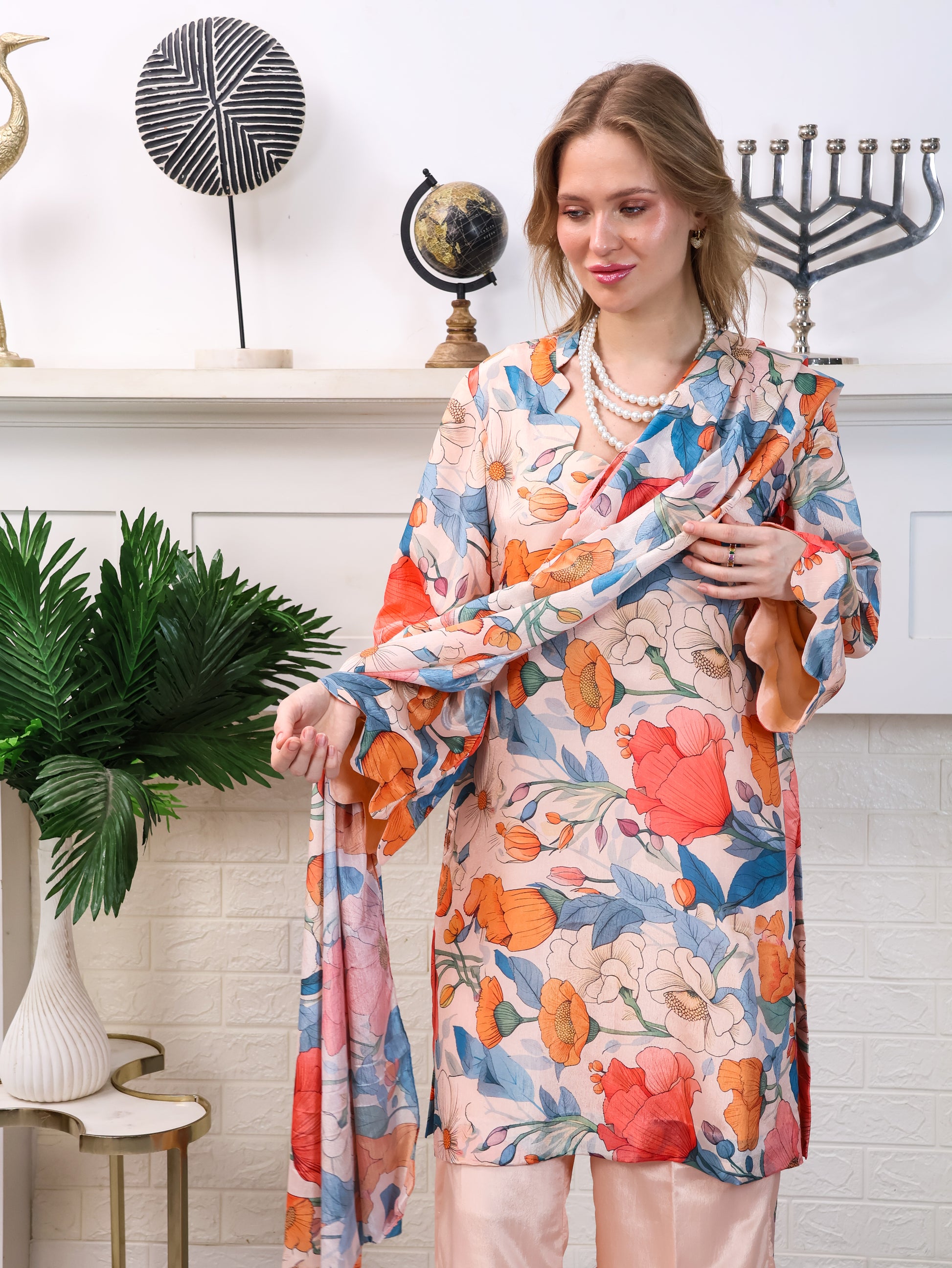 This Peach Floral Chinon-Chiffon Suit Set features a delicate floral print on luxurious chinon-chiffon fabric. The soft, flowy material offers an elegant drape, while the vibrant pink hues add a touch of femininity and charm. Perfect for festive occasions or evening events, this suit set combines grace and comfort effortlessly.