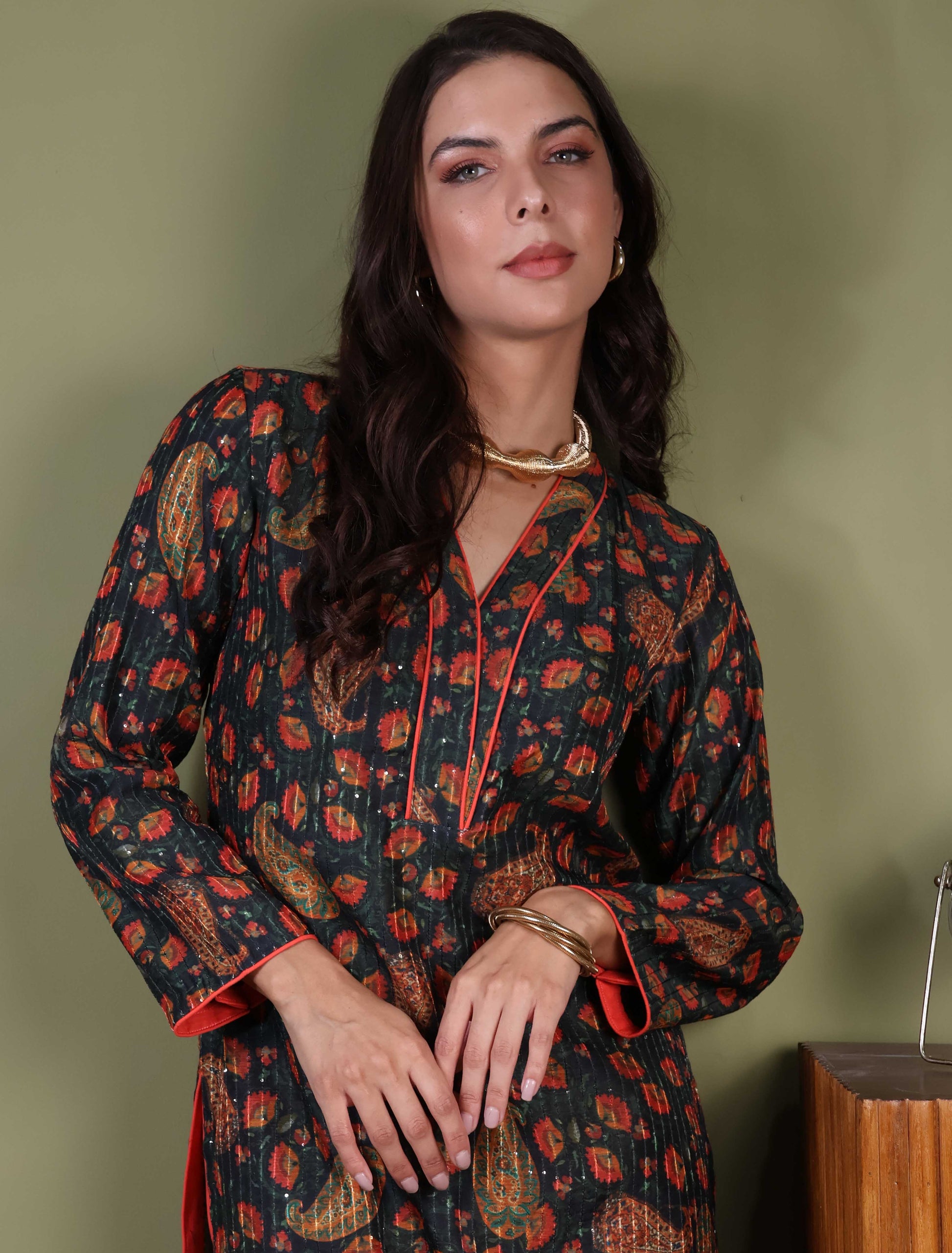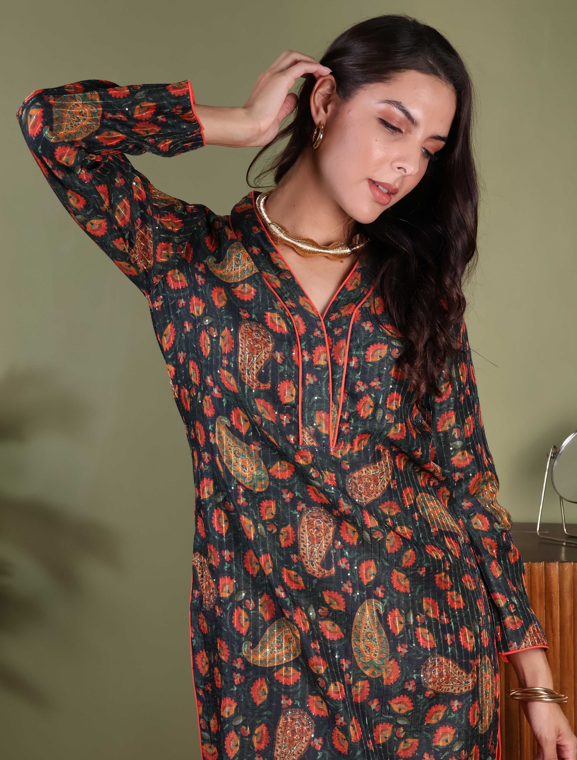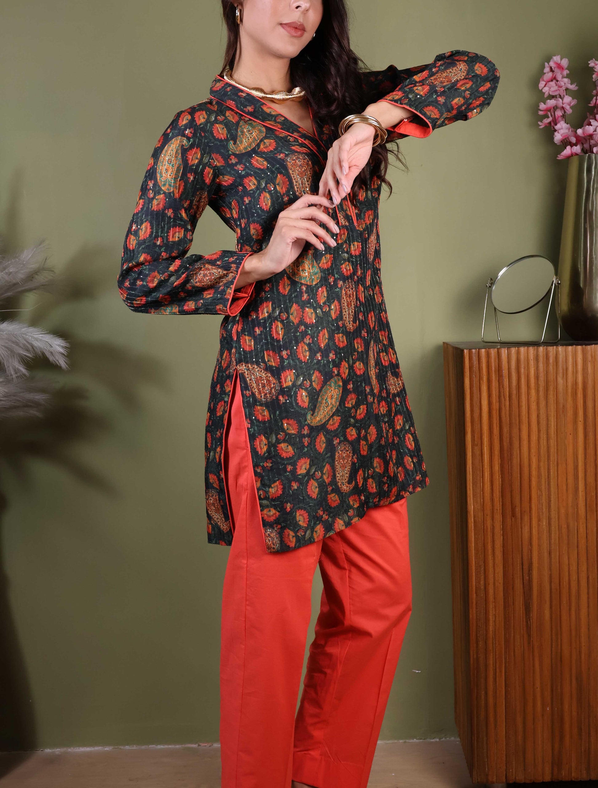 A Prussian Blue Chanderi kurta and cotton pant set combines the elegance of luxurious fabric with the practicality of comfortable wear. Made from Chanderi, a lightweight and sheer fabric known for its fine texture and subtle sheen. This adds an elegant, almost ethereal quality to the kurta. Prussian Blue is a deep, intense shade of blue with a slightly greenish undertone, providing a sophisticated and striking look. Cotton pants are chosen for their breathability and comfort. They provide a relaxed contrast to the more formal kurta. The pants in contrast shade of orange are tailored to fit well but remain comfortable, with a straight or slightly tapered leg.