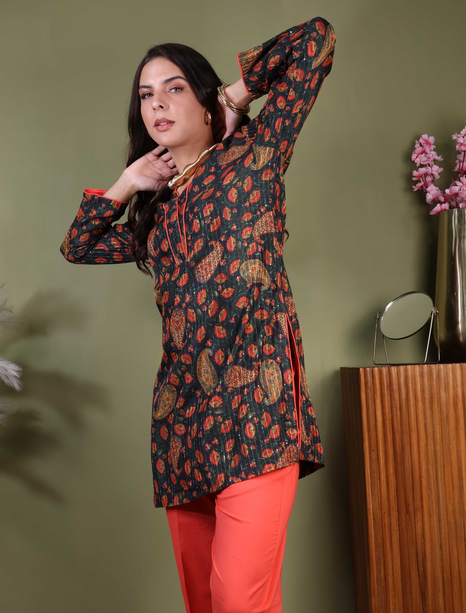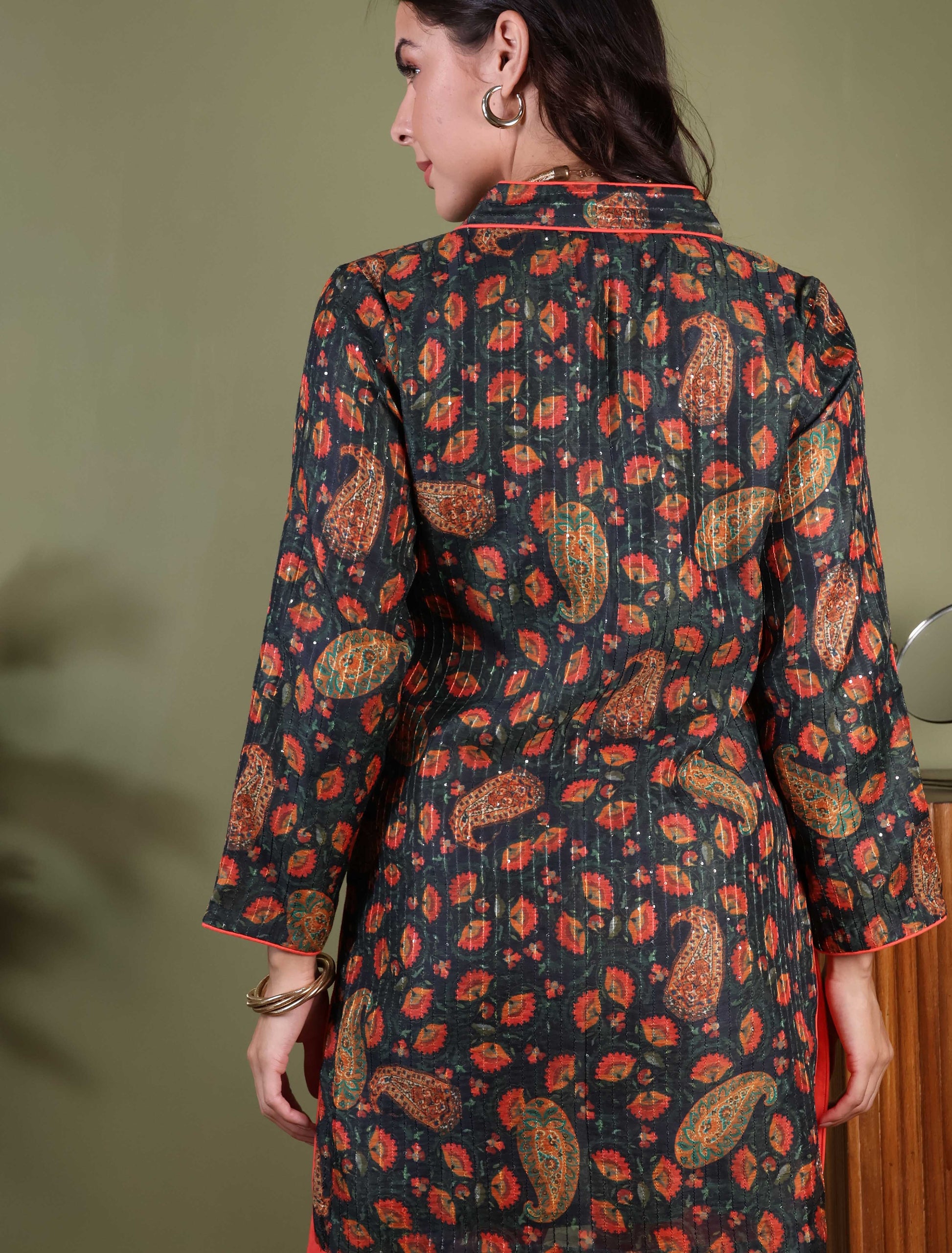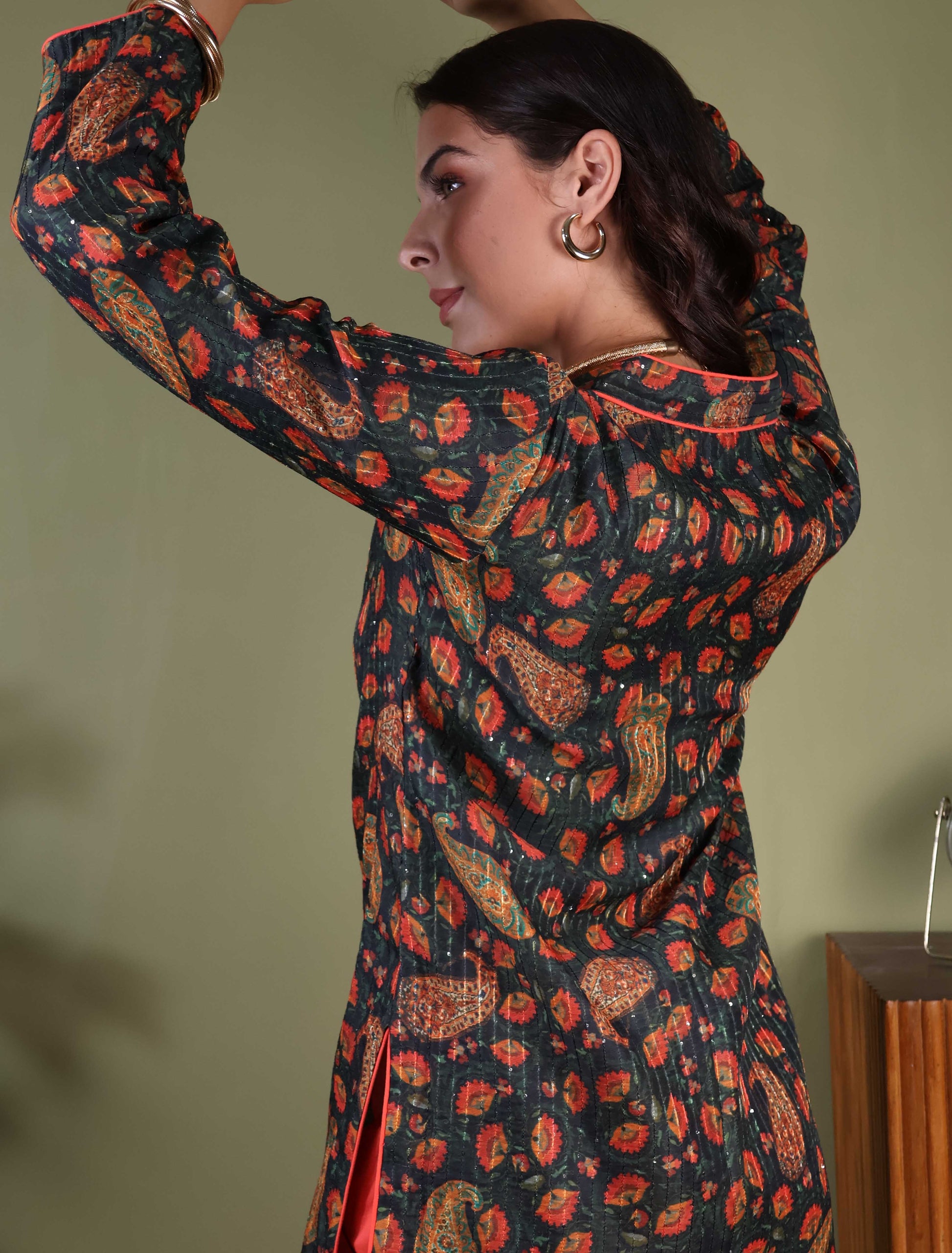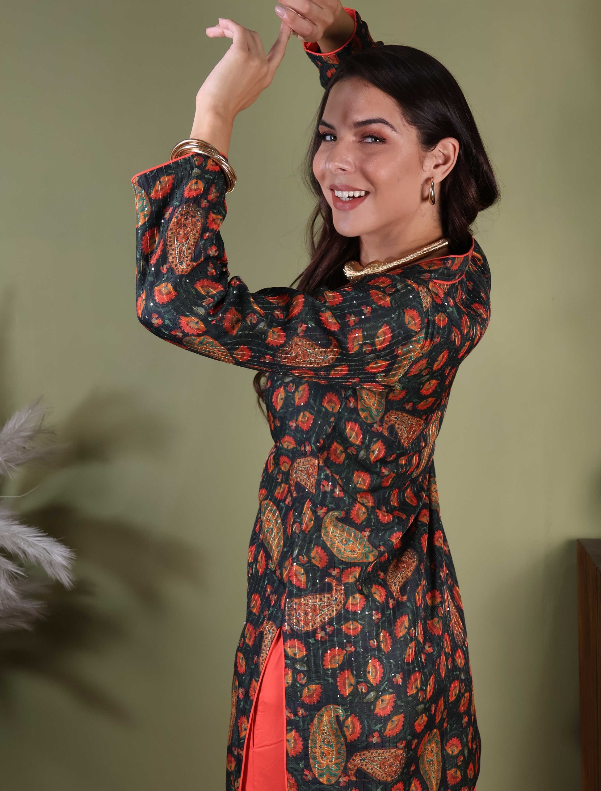 A Prussian Blue Chanderi kurta and cotton pant set combines the elegance of luxurious fabric with the practicality of comfortable wear. Made from Chanderi, a lightweight and sheer fabric known for its fine texture and subtle sheen. This adds an elegant, almost ethereal quality to the kurta. Prussian Blue is a deep, intense shade of blue with a slightly greenish undertone, providing a sophisticated and striking look. Cotton pants are chosen for their breathability and comfort. They provide a relaxed contrast to the more formal kurta. The pants in contrast shade of orange are tailored to fit well but remain comfortable, with a straight or slightly tapered leg.