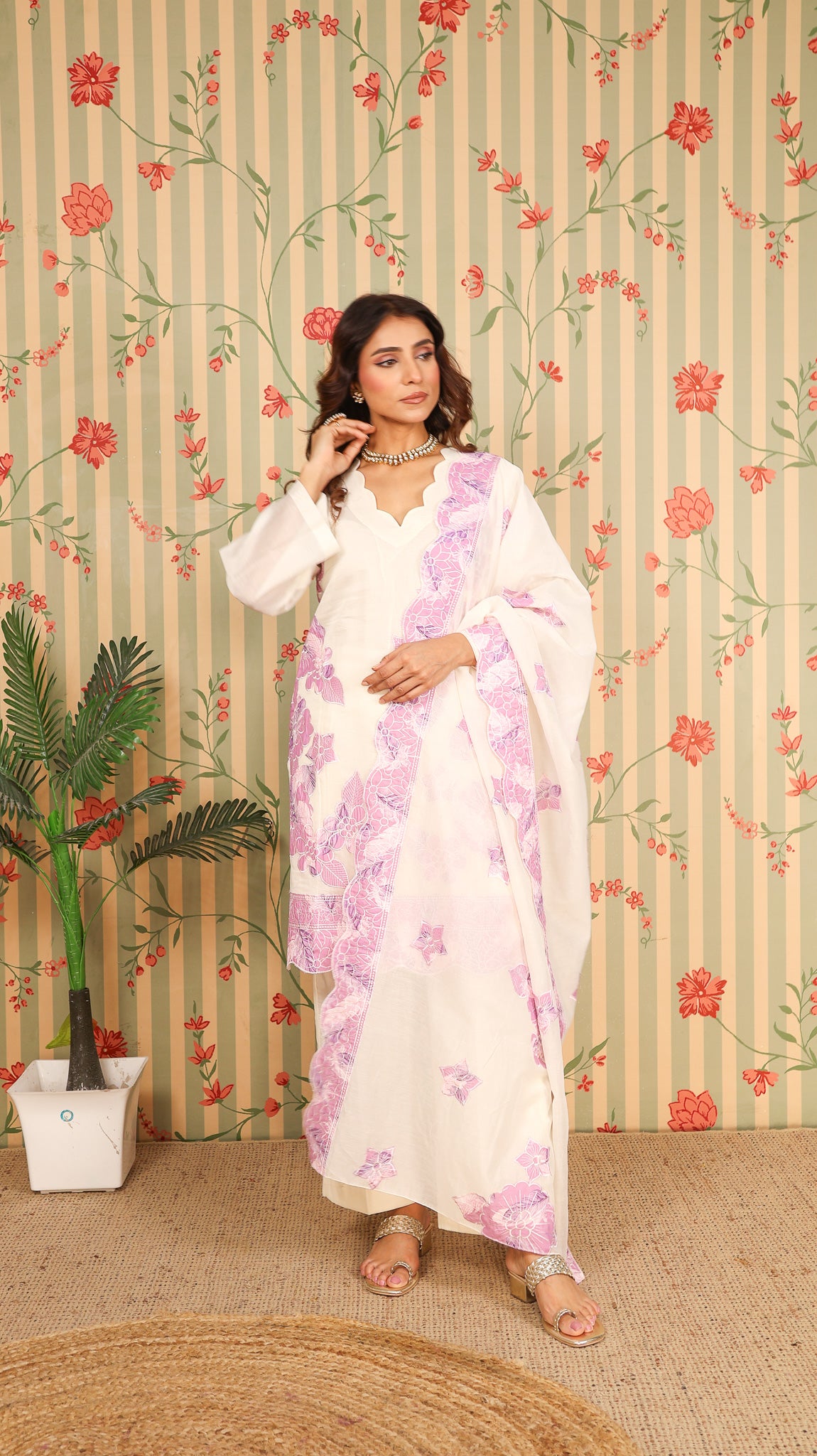 Make a graceful statement with the Purple Off-White Suit Set, featuring a harmonious blend of soft off-white fabric accented with rich purple details. Perfect for festive occasions or elegant gatherings, this set combines traditional charm with modern sophistication.