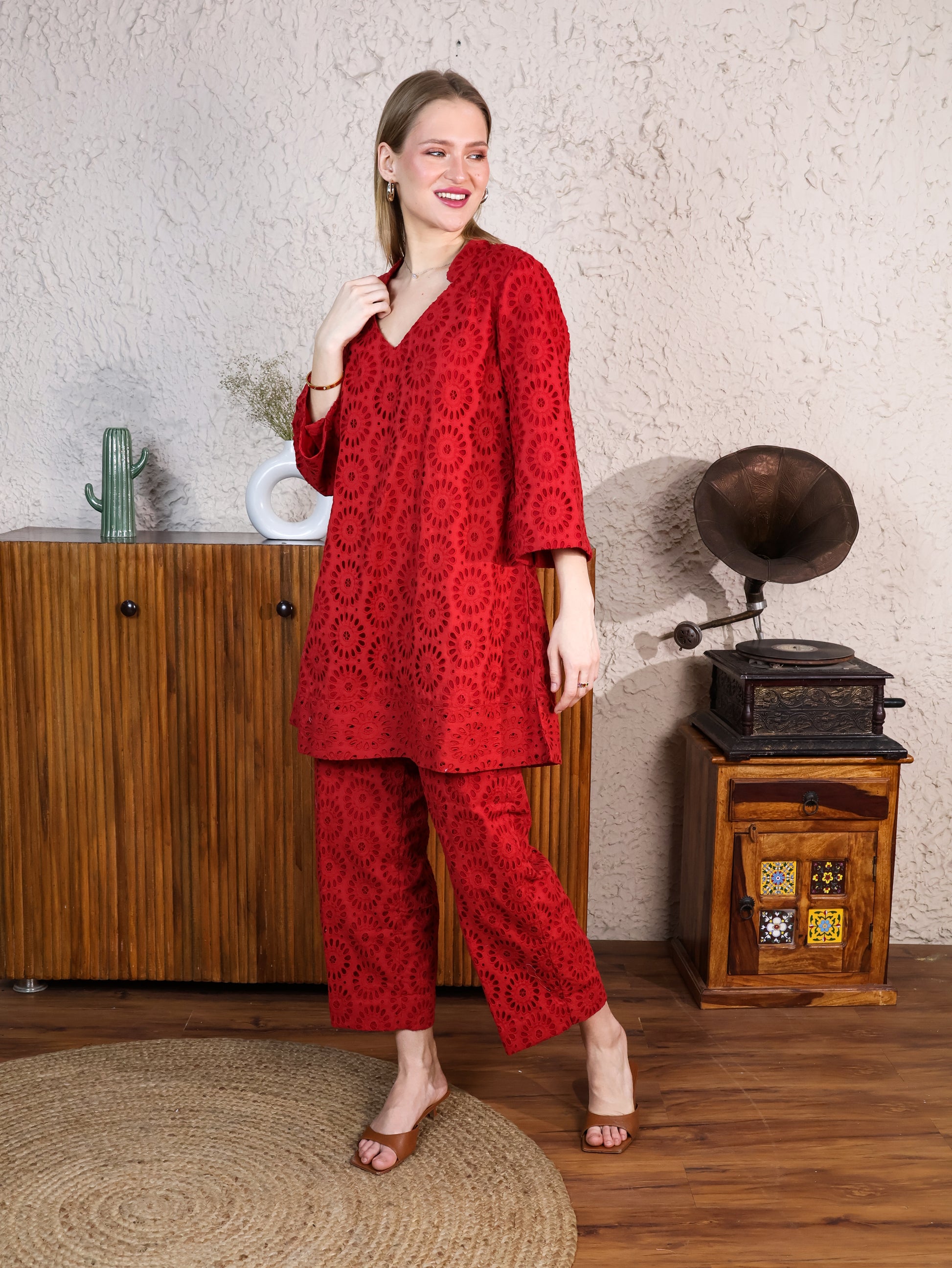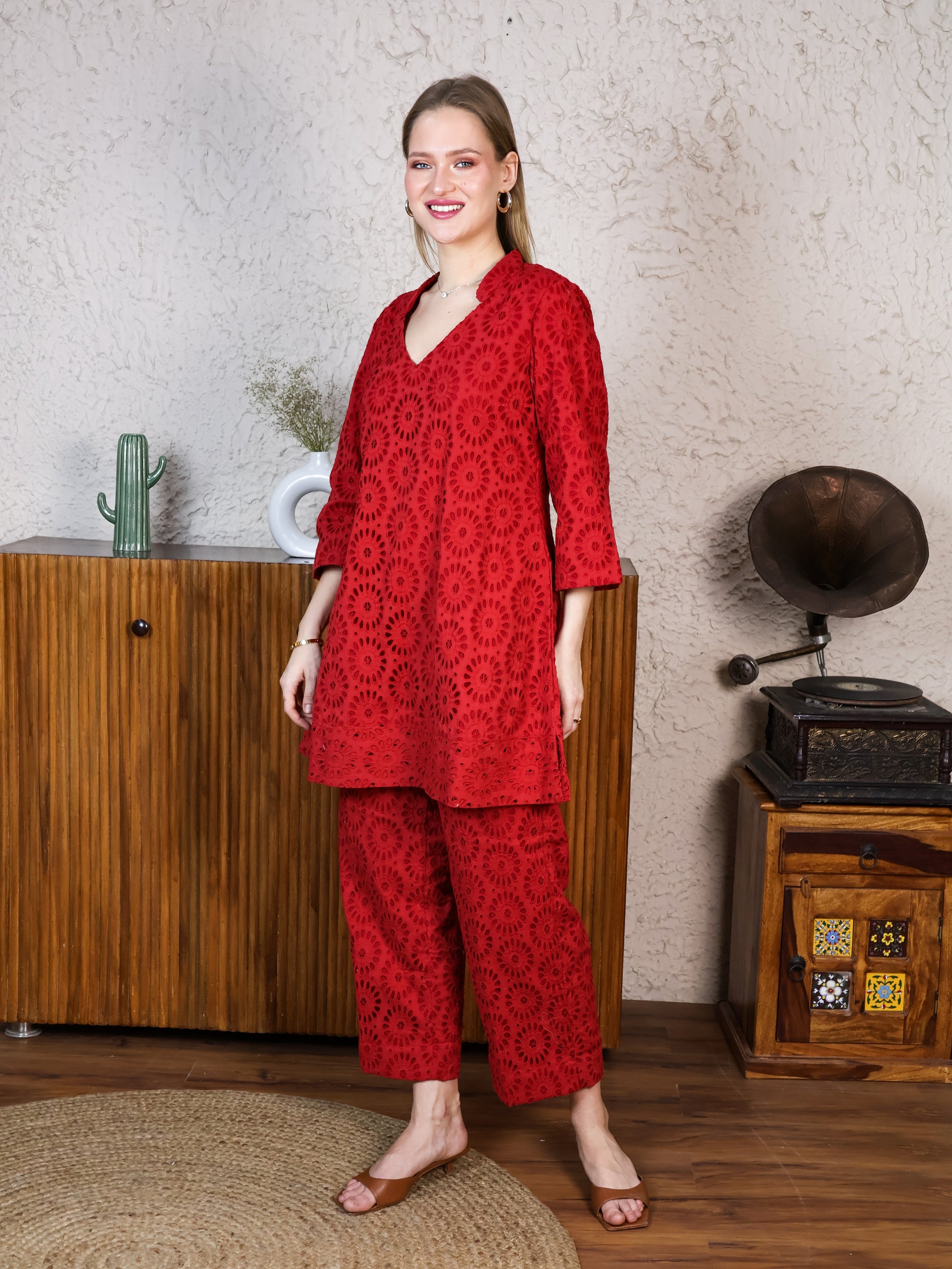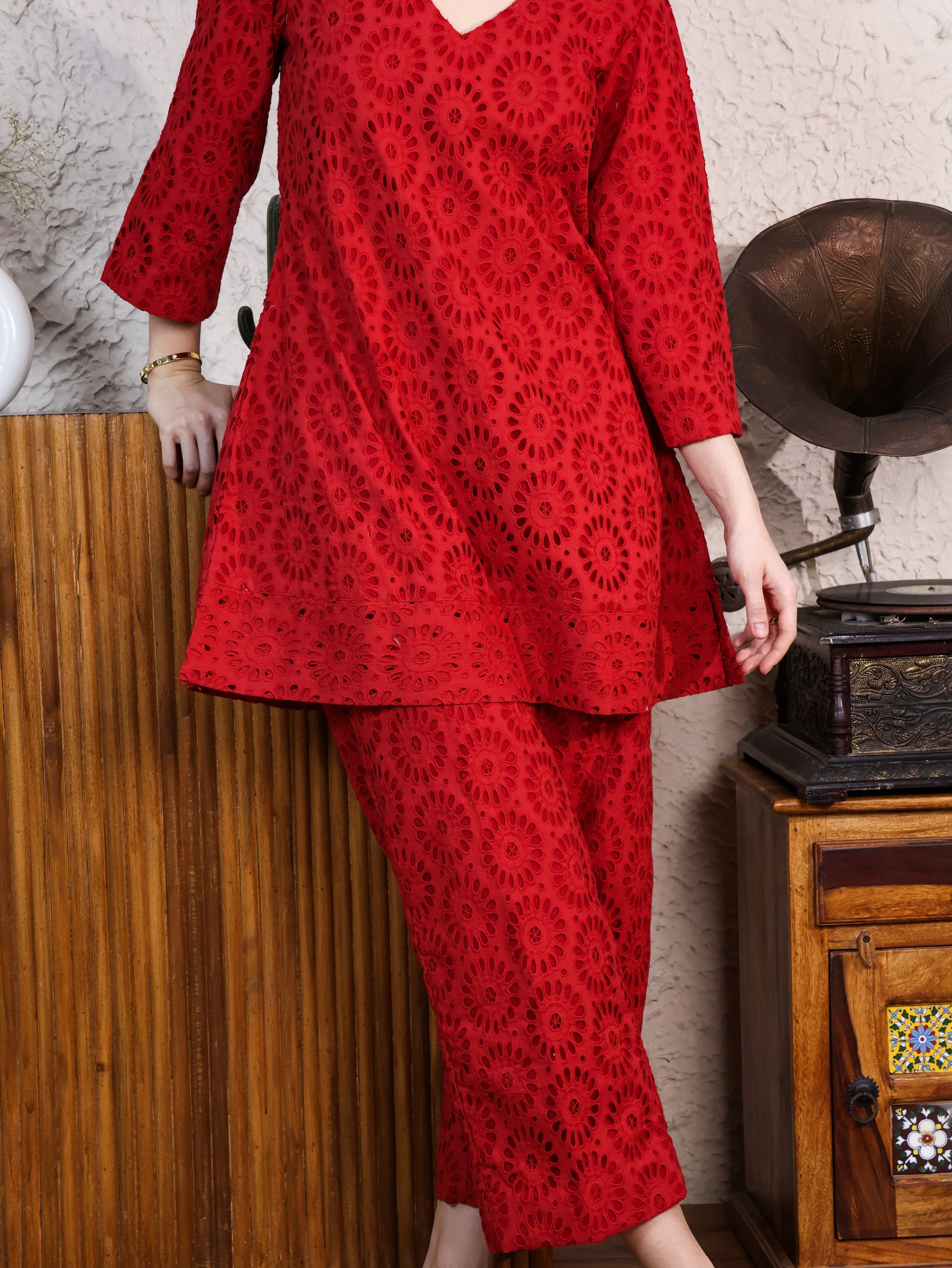Red Cotton Rooster A-line Top & Pants Coordset