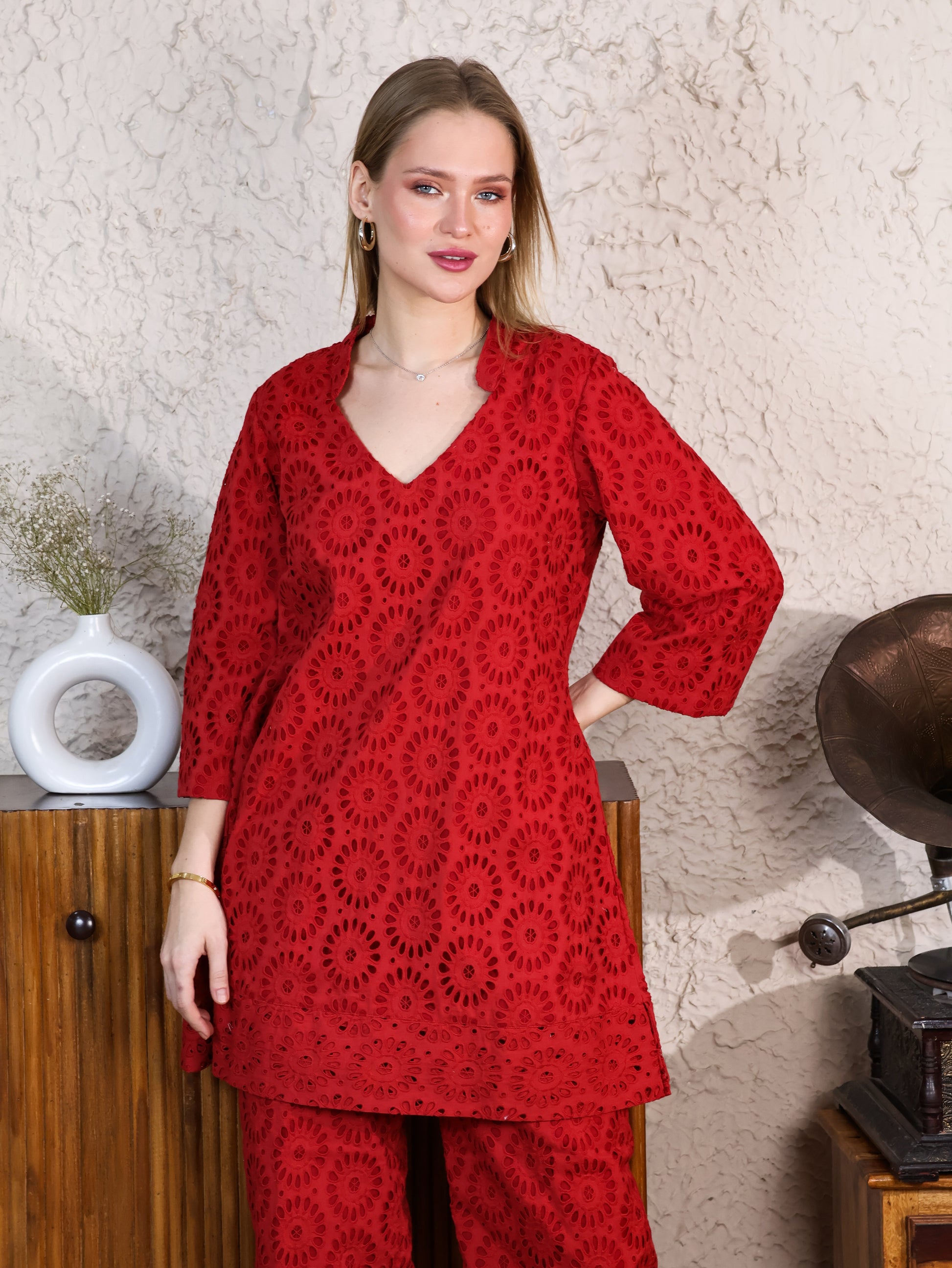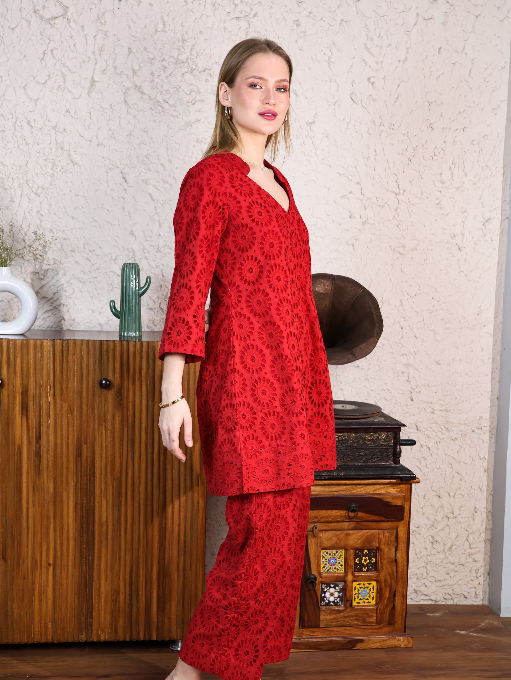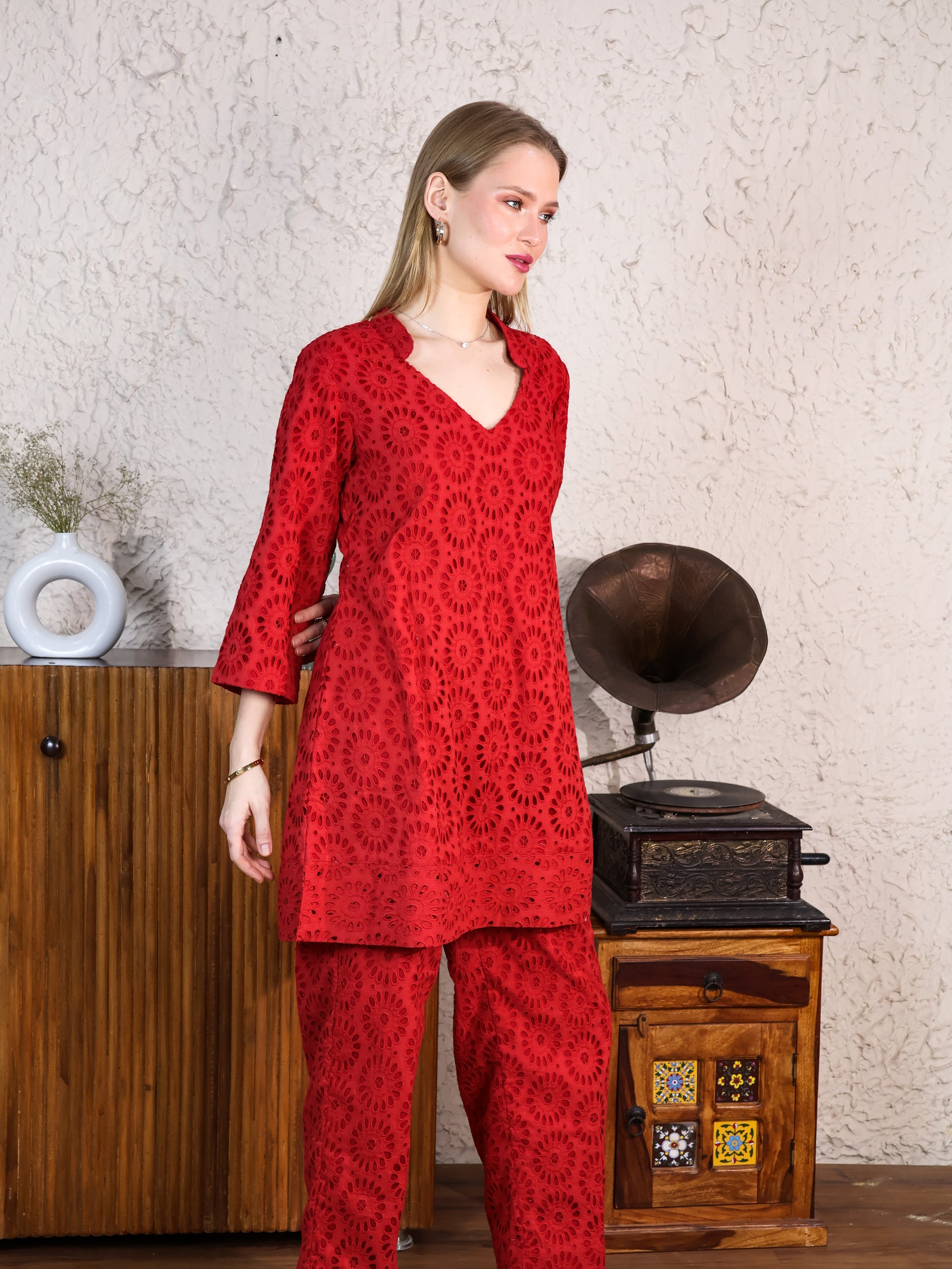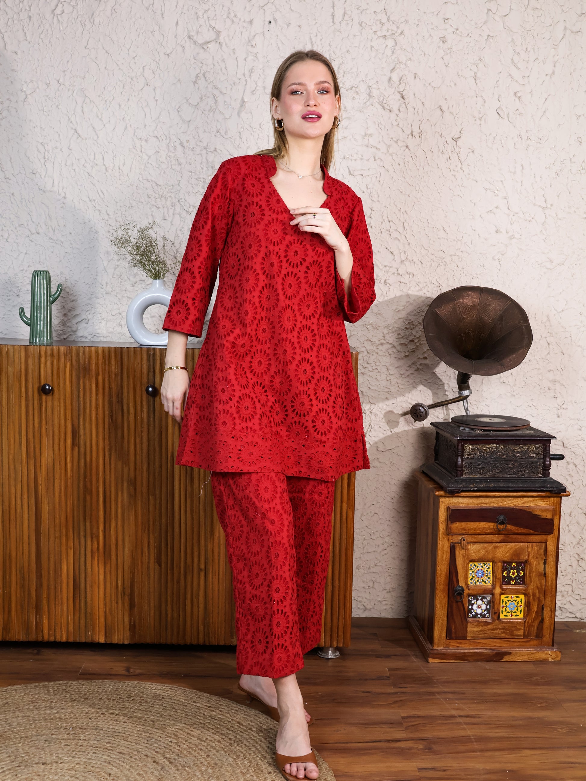 Red Cotton Rooster A-line Top & Pants Coordset