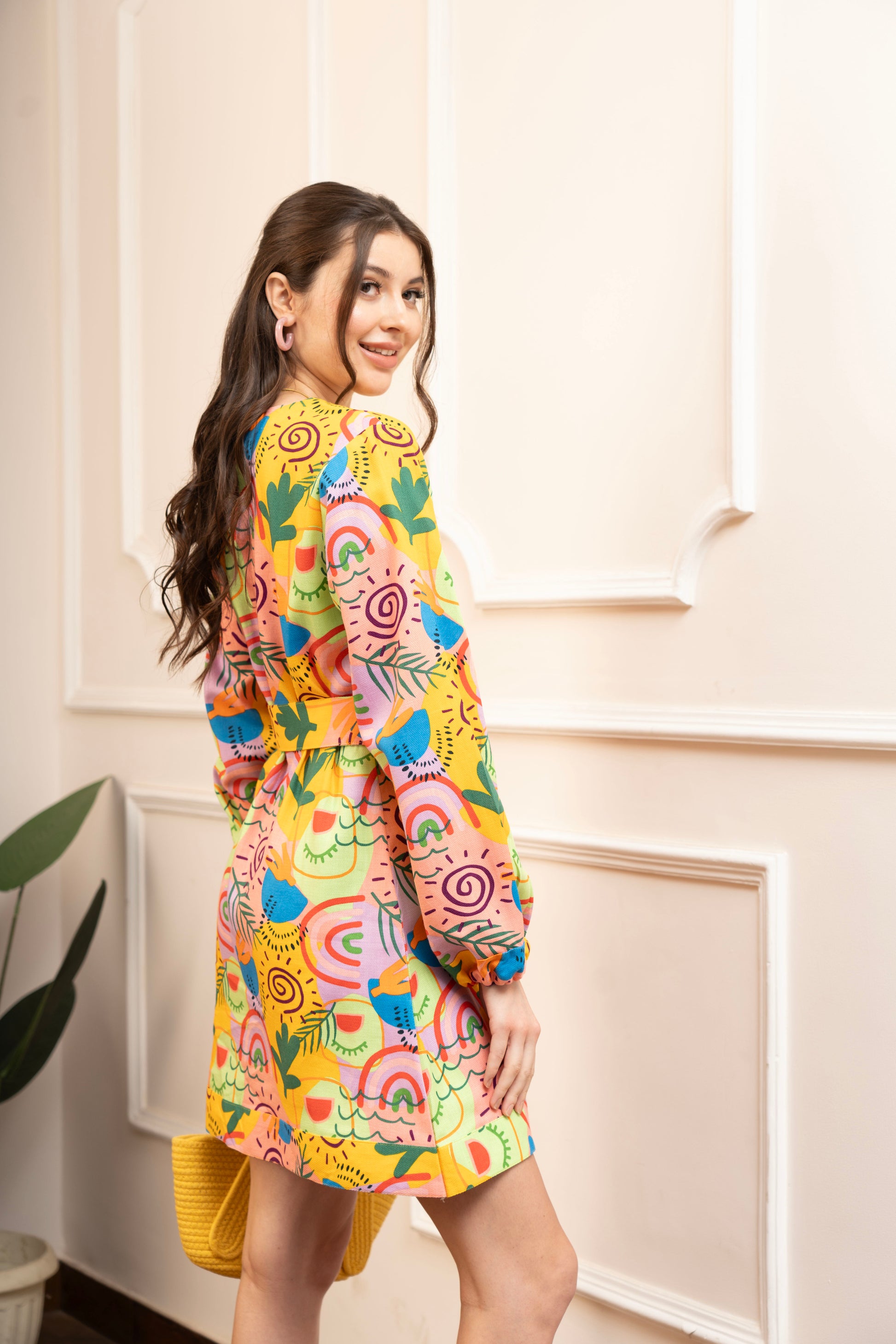 Bumblebee printed straight-cut dress , awash in a rich shade of dark yellow adorned with vibrant, colorful prints throughout. This charming piece includes a chic tie-up belt, making it an essential addition to any resort wardrobe. Ideal for leisurely days by the pool or relaxing on the beach, it embodies both comfort and elegance, ensuring you look and feel fabulous under the sun.